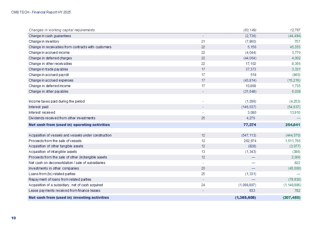 Changes in working capital requirements  (63,149)  12,767  Change in cash guarantees  -  (2,736)  (44,494)  Change in inventory  21  (7,860)  757  Change in receivables from contracts with customers  22  5,156  45,353  Change in accrued income  22  (4,044)  3,770  Change in deferred charges  22  (44,064)  4,002  Change in other receivables  22  17,102  8,356  Change in trade payables  17  37,373  3,331  Change in accrued payroll  17  518  (865)  Change in accrued expenses  17  (43,814)  (15,216)  Change in deferred income  17  10,868  1,735  Change in other payables  -  (31,648)  6,038  Income taxes paid during the period  -  (1,296)  (4,253)  Interest paid  -  (146,037)  (54,637)  Interest received  -  3,080  13,910  Dividends received from other investments  25  4,276  —  Net cash from (used in) operating activities  77,374  254,641  Acquisition of vessels and vessels under construction  12  (547,113)  (444,570)  Proceeds from the sale of vessels  12  262,974  1,511,765  Acquisition of other tangible assets  12  (828)  (3,077)  Acquisition of intangible assets  13  (1,343)  (386)  Proceeds from the sale of other (in)tangible assets  12  —  2,000  Net cash on deconsolidation / sale of subsidiaries  -  —  822  Investments in other companies  20  —  (45,000)  Loans from (to) related parties  25  (1,331)  —  Repayment of loans from related parties  -  —  (79,930)  Acquisition of a subsidiary, net of cash acquired  24  (1,098,897)  (1,149,886)  Lease payments received from finance leases  -  933  782  Net cash from (used in) investing activities  (1,385,605)  (207,480)  CMB.TECH - Financial Report HY 2025  10