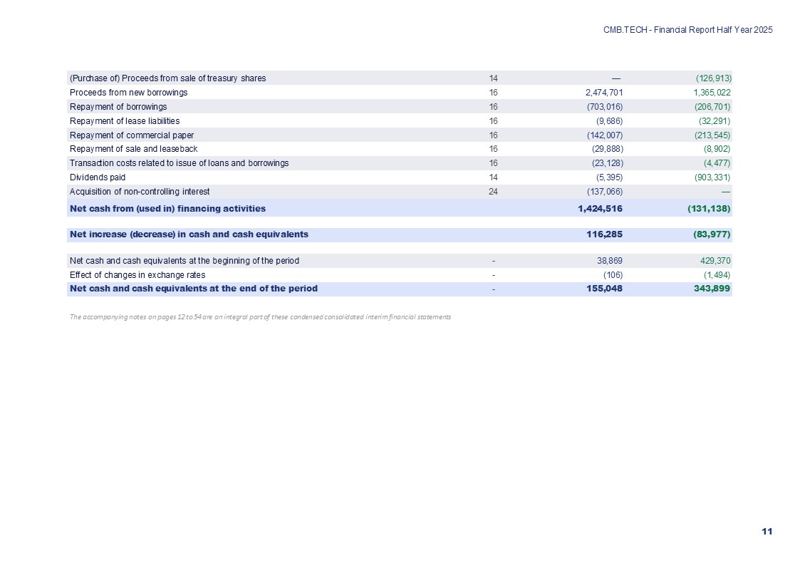 (Purchase of) Proceeds from sale of treasury shares  14  —  (126,913)  Proceeds from new borrowings  16  2,474,701  1,365,022  Repayment of borrowings  16  (703,016)  (206,701)  Repayment of lease liabilities  16  (9,686)  (32,291)  Repayment of commercial paper  16  (142,007)  (213,545)  Repayment of sale and leaseback  16  (29,888)  (8,902)  Transaction costs related to issue of loans and borrowings  16  (23,128)  (4,477)  Dividends paid  14  (5,395)  (903,331)  Acquisition of non-controlling interest  24  (137,066)  —  Net cash from (used in) financing activities  1,424,516  (131,138)  Net increase (decrease) in cash and cash equivalents  116,285  (83,977)  Net cash and cash equivalents at the beginning of the period  -  38,869  429,370  Effect of changes in exchange rates  -  (106)  (1,494)  Net cash and cash equivalents at the end of the period  -  155,048  343,899  The accompanying notes on pages 12 to 54 are an integral part of these condensed consolidated interim financial statements  CMB.TECH - Financial Report Half Year 2025  11