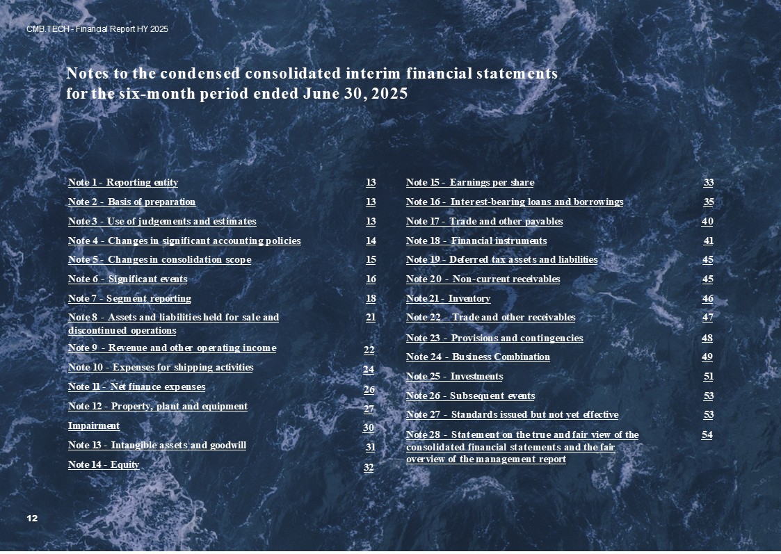 Notes to the condensed consolidated interim financial statements for the six-month period ended June 30, 2025  22  24  26  27  discontinued operations  Note 9 - Revenue and other operating income Note 10 - Expenses for shipping activities Note 11 - Net finance expenses  Note 12 - Property, plant and equipment Impairment  Note 13 - Intangible assets and goodwill Note 14 - Equity  30  31  32  Note 1 - Reporting entity  13  Note 15 - Earnings per share  33  Note 2 - Basis of preparation  13  Note 16 - Interest-bearing loans and borrowings  35  Note 3 - Use of judgements and estimates  13  Note 17 - Trade and other payables  40  Note 4 - Changes in significant accounting policies  14  Note 18 - Financial instruments  41  Note 5 - Changes in consolidation scope  15  Note 19 - Deferred tax assets and liabilities  45  Note 6 - Significant events  16  Note 20 - Non-current receivables  45  Note 7 - Segment reporting  18  Note 21 - Inventory  46  Note 8 - Assets and liabilities held for sale and  21  Note 22 - Trade and other receivables  47  Note 23 - Provisions and contingencies  48  Note 24 - Business Combination  49  Note 25 - Investments  51  Note 26 - Subsequent events  53  Note 27 - Standards issued but not yet effective  53  Note 28 - Statement on the true and fair view of the consolidated financial statements and the fair overview of the management report  54  CMB.TECH - Financial Report HY 2025  12
