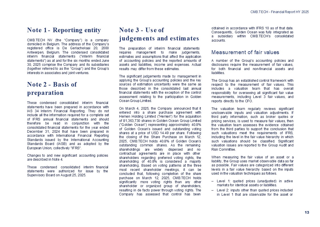 Note 1 - Reporting entity  CMB.TECH NV (the “Company”) is a company domiciled in Belgium. The address of the Company’s registered office is De Gerlachekaai 20, 2000 Antwerpen, Belgium. The condensed consolidated interim financial statements ("interim financial statements") as at and for the six months ended June 30, 2025 comprise the Company and its subsidiaries (together referred to as the “Group”) and the Group’s interests in associates and joint ventures.  Note 2 - Basis of preparation  These condensed consolidated  interim financial  statements have been prepared in accordance with lAS 34 Interim Financial Reporting. They do not include all the information required for a complete set of IFRS annual financial statements and should therefore be read in conjunction with the consolidated financial statements for the year ended December 31, 2024 that have been prepared in accordance with International Financial Reporting Standards issued by the International Accounting Standards Board (IASB) and as adopted by the European Union, collectively "IFRS".  Changes to and new significant accounting policies are described in Note 4.  These condensed consolidated interim statements were authorized for issue Supervisory Board on August 25, 2025.  financial by the  Note 3 - Use of judgements and estimates  The preparation of interim financial statements  requires management to make judgements,  estimates and assumptions that affect the application of accounting policies and the reported amounts of assets and liabilities, income and expenses. Actual results may differ from these estimates.  The significant judgements made by management in applying the Group's accounting policies and the key sources of estimation uncertainty were the same as those described in the consolidated last annual financial statements with the exception of the control assessment relating to the participation in Golden Ocean Group Limited.  On March 4, 2025, the Company announced that it entered into a share purchase agreement with Hemen Holding Limited ("Hemen") for the acquisition of 81,363,730 shares in Golden Ocean Group Limited ("Golden Ocean") representing approximately 40.8% of Golden Ocean’s issued and outstanding voting shares at a price of USD 14.49 per share. Following the closing of the Share Purchase on March 12, 2025, CMB.TECH holds 40.8% of Golden Ocean’s outstanding common shares. As the remaining  shareholdings are widely contractual agreements are  dispersed and no in place with other  shareholders regarding preferred voting rights, the shareholding of 40.8% is considered a majority shareholding. Based on voting patterns at the three most recent shareholder meetings, it can be concluded that, following completion of the share purchase on March 12, 2025, CMB.TECH holds significantly more voting rights than any other shareholder or organized group of shareholders, resulting in de facto power through voting rights. The Company has assessed that control has been  obtained in accordance with IFRS 10 as of that date. Consequently, Golden Ocean was fully integrated as a subsidiary within CMB.TECH’s consolidated accounts.  Measurement of fair values  A number of the Group's accounting policies and disclosures require the measurement of fair values, for both financial and non-financial assets and liabilities.  The Group has an established control framework with respect to the measurement of fair values. This includes a valuation team that has overall responsibility for overseeing all significant fair value measurements, including Level 3 fair values, and reports directly to the CFO.  The valuation team regularly reviews significant unobservable inputs and valuation adjustments. If third party information, such as broker quotes or pricing services, is used to measure fair values, then the valuation team assesses the evidence obtained from the third parties to support the conclusion that such valuations meet the requirements of IFRS, including the level in the fair value hierarchy in which such valuations should be classified. Significant valuation issues are reported to the Group Audit and Risk Committee.  When measuring the fair value of an asset or a liability, the Group uses market observable data as far as possible. Fair values are categorized into different levels in a fair value hierarchy based on the inputs used in the valuation techniques as follows.  Level 1: quoted prices (unadjusted) in active markets for identical assets or liabilities.  Level 2: inputs other than quoted prices included in Level 1 that are observable for the asset or  CMB.TECH - Financial Report HY 2025  13