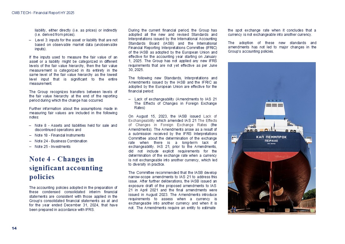 liability, either directly (i.e. as prices) or indirectly (i.e. derived from prices).  – Level 3: inputs for the asset or liability that are not based on observable market data (unobservable inputs).  If the inputs used to measure the fair value of an asset or a liability might be categorized in different levels of the fair value hierarchy, then the fair value measurement is categorized in its entirety in the same level of the fair value hierarchy as the lowest level input that is significant to the entire measurement.  The Group recognizes transfers between levels of the fair value hierarchy at the end of the reporting period during which the change has occurred.  Further information about the assumptions made in measuring fair values are included in the following notes:  Note 8 - Assets and liabilities held for sale and discontinued operations and  Note 18 - Financial Instruments  Note 24 - Business Combination  Note 25 - Investments  Note 4 - Changes in significant accounting policies  The accounting policies adopted in the preparation of these condensed consolidated interim financial statements are consistent with those applied in the Group's consolidated financial statements as at and for the year ended December 31, 2024, that have been prepared in accordance with IFRS.  During the current financial period, the Group has adopted all the new and revised Standards and Interpretations issued by the International Accounting Standards Board (IASB) and the International Financial Reporting Interpretations Committee (IFRIC) of the IASB as adopted by the European Union and effective for the accounting year starting on January 1, 2025. The Group has not applied any new IFRS requirements that are not yet effective as per June 30, 2025.  The following new Standards, Interpretations and Amendments issued by the IASB and the IFRIC as adopted by the European Union are effective for the financial period:  – Lack of exchangeability (Amendments to IAS 21 The Effects of Changes in Foreign Exchange Rates)  On August 15, 2023, the IASB issued Lack of Exchangeability which amended IAS 21 The Effects of Changes in Foreign Exchange Rates (the Amendments). The Amendments arose as a result of a submission received by the IFRS Interpretations Committee about the determination of the exchange rate when there is a long-term lack of exchangeability. IAS 21, prior to the Amendments, did not include explicit requirements for the determination of the exchange rate when a currency is not exchangeable into another currency, which led to diversity in practice.  The Committee recommended that the IASB develop narrow-scope amendments to IAS 21 to address this issue. After further deliberations, the IASB issued an exposure draft of the proposed amendments to IAS  21 in April 2021 and the final amendments were issued in August 2023. The Amendments introduce requirements to assess when a currency is exchangeable into another currency and when it is not. The Amendments require an entity to estimate  the spot exchange rate when it concludes that a currency is not exchangeable into another currency.  The adoption of these new standards and amendments has not led to major changes in the Group’s accounting policies.  CMB.TECH - Financial Report HY 2025  14