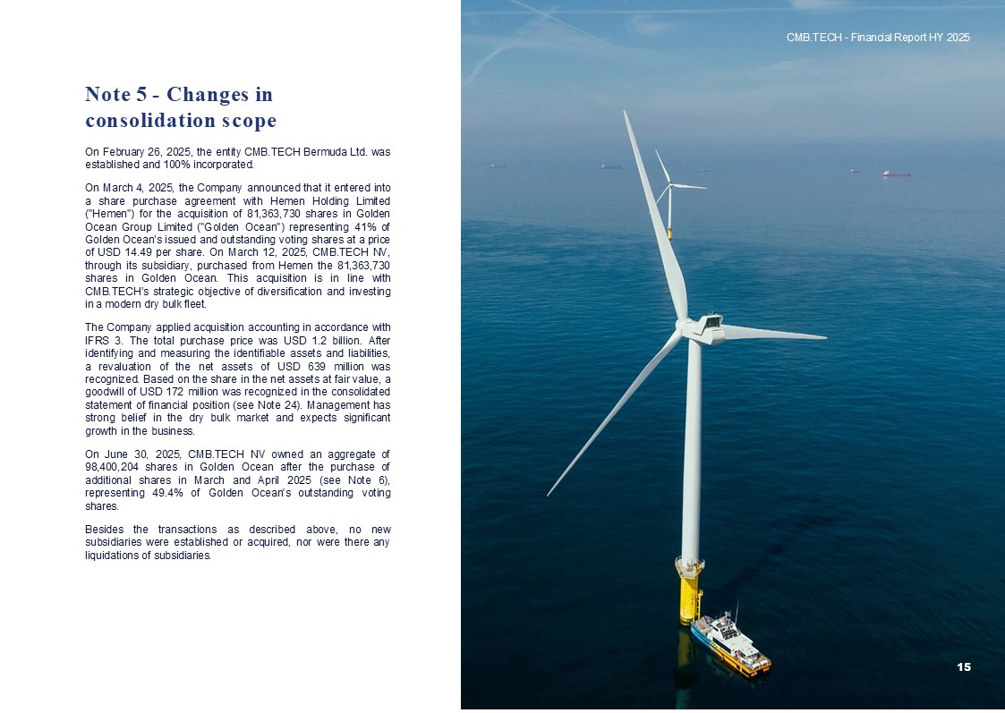 Note 5 - Changes in consolidation scope  On February 26, 2025, the entity CMB.TECH Bermuda Ltd. was established and 100% incorporated.  On March 4, 2025, the Company announced that it entered into a share purchase agreement with Hemen Holding Limited ("Hemen") for the acquisition of 81,363,730 shares in Golden Ocean Group Limited ("Golden Ocean") representing 41% of Golden Ocean’s issued and outstanding voting shares at a price of USD 14.49 per share. On March 12, 2025, CMB.TECH NV, through its subsidiary, purchased from Hemen the 81,363,730 shares in Golden Ocean. This acquisition is in line with CMB.TECH’s strategic objective of diversification and investing in a modern dry bulk fleet.  The Company applied acquisition accounting in accordance with IFRS 3. The total purchase price was USD 1.2 billion. After identifying and measuring the identifiable assets and liabilities, a revaluation of the net assets of USD 639 million was recognized. Based on the share in the net assets at fair value, a goodwill of USD 172 million was recognized in the consolidated statement of financial position (see Note 24). Management has strong belief in the dry bulk market and expects significant growth in the business.  On June 30, 2025, CMB.TECH NV owned an aggregate of 98,400,204 shares in Golden Ocean after the purchase of additional shares in March and April 2025 (see Note 6), representing 49.4% of Golden Ocean's outstanding voting shares.  Besides the transactions as described above, no new subsidiaries were established or acquired, nor were there any liquidations of subsidiaries.  CMB.TECH - Financial Report HY 2025  15