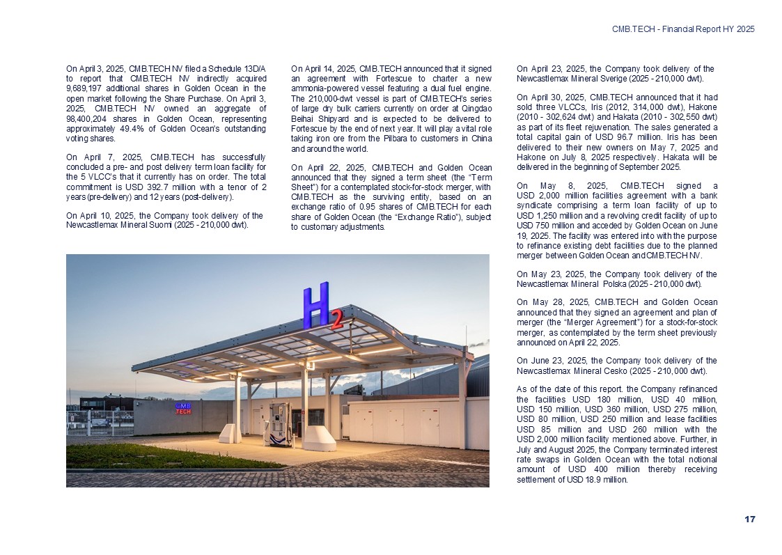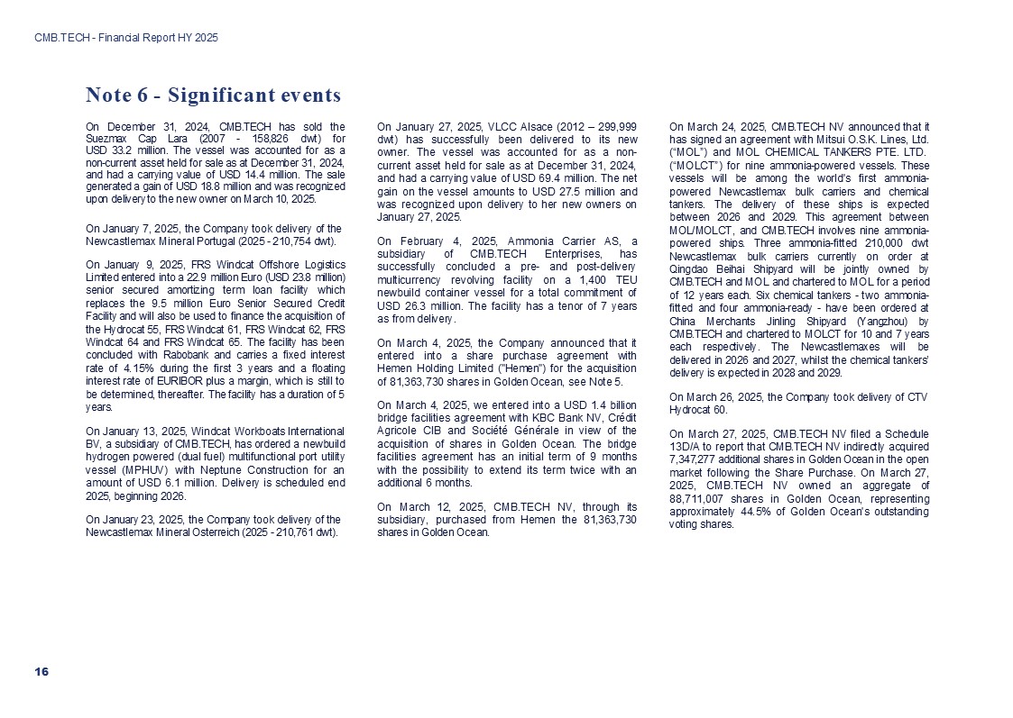 Note 6 - Significant events  On December 31, 2024, CMB.TECH has sold the Suezmax Cap Lara (2007 - 158,826 dwt) for USD 33.2 million. The vessel was accounted for as a non-current asset held for sale as at December 31, 2024, and had a carrying value of USD 14.4 million. The sale generated a gain of USD 18.8 million and was recognized upon delivery to the new owner on March 10, 2025.  On January 7, 2025, the Company took delivery of the Newcastlemax Mineral Portugal (2025 - 210,754 dwt).  On January 9, 2025, FRS Windcat Offshore Logistics Limited entered into a 22.9 million Euro (USD 23.8 million) senior secured amortizing term loan facility which replaces the 9.5 million Euro Senior Secured Credit Facility and will also be used to finance the acquisition of the Hydrocat 55, FRS Windcat 61, FRS Windcat 62, FRS Windcat 64 and FRS Windcat 65. The facility has been concluded with Rabobank and carries a fixed interest rate of 4.15% during the first 3 years and a floating interest rate of EURIBOR plus a margin, which is still to be determined, thereafter. The facility has a duration of 5 years.  On January 13, 2025, Windcat Workboats International BV, a subsidiary of CMB.TECH, has ordered a newbuild hydrogen powered (dual fuel) multifunctional port utility vessel (MPHUV) with Neptune Construction for an amount of USD 6.1 million. Delivery is scheduled end 2025, beginning 2026.  On January 23, 2025, the Company took delivery of the Newcastlemax Mineral Osterreich (2025 - 210,761 dwt).  On January 27, 2025, VLCC Alsace (2012 – 299,999 dwt) has successfully been delivered to its new owner. The vessel was accounted for as a non- current asset held for sale as at December 31, 2024, and had a carrying value of USD 69.4 million. The net gain on the vessel amounts to USD 27.5 million and was recognized upon delivery to her new owners on January 27, 2025.  On February 4, 2025, Ammonia Carrier AS, a subsidiary of CMB.TECH Enterprises, has successfully concluded a pre- and post-delivery multicurrency revolving facility on a 1,400 TEU newbuild container vessel for a total commitment of USD 26.3 million. The facility has a tenor of 7 years as from delivery.  On March 4, 2025, the Company announced that it entered into a share purchase agreement with Hemen Holding Limited ("Hemen") for the acquisition of 81,363,730 shares in Golden Ocean, see Note 5.  On March 4, 2025, we entered into a USD 1.4 billion bridge facilities agreement with KBC Bank NV, Crédit Agricole CIB and Société Générale in view of the acquisition of shares in Golden Ocean. The bridge facilities agreement has an initial term of 9 months with the possibility to extend its term twice with an additional 6 months.  On March 12, 2025, CMB.TECH NV, through its subsidiary, purchased from Hemen the 81,363,730 shares in Golden Ocean.  On March 24, 2025, CMB.TECH NV announced that it has signed an agreement with Mitsui O.S.K. Lines, Ltd. (“MOL”) and MOL CHEMICAL TANKERS PTE. LTD.  (“MOLCT”) for nine ammonia-powered vessels. These vessels will be among the world's first ammonia- powered Newcastlemax bulk carriers and chemical tankers. The delivery of these ships is expected between 2026 and 2029. This agreement between MOL/MOLCT, and CMB.TECH involves nine ammonia- powered ships. Three ammonia-fitted 210,000 dwt Newcastlemax bulk carriers currently on order at Qingdao Beihai Shipyard will be jointly owned by CMB.TECH and MOL and chartered to MOL for a period of 12 years each. Six chemical tankers - two ammonia- fitted and four ammonia-ready - have been ordered at China Merchants Jinling Shipyard (Yangzhou) by CMB.TECH and chartered to MOLCT for 10 and 7 years each respectively. The Newcastlemaxes will be delivered in 2026 and 2027, whilst the chemical tankers’ delivery is expected in 2028 and 2029.  On March 26, 2025, the Company took delivery of CTV Hydrocat 60.  On March 27, 2025, CMB.TECH NV filed a Schedule 13D/A to report that CMB.TECH NV indirectly acquired 7,347,277 additional shares in Golden Ocean in the open market following the Share Purchase. On March 27, 2025, CMB.TECH NV owned an aggregate of 88,711,007 shares in Golden Ocean, representing approximately 44.5% of Golden Ocean's outstanding voting shares.  CMB.TECH - Financial Report HY 2025  16