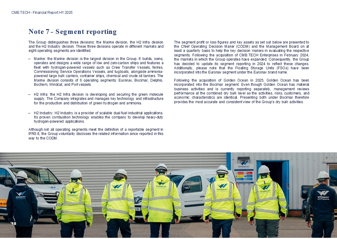 Note 7 - Segment reporting  The Group distinguishes three divisions: the Marine division, the H2 Infra division and the H2 Industry division. These three divisions operate in different markets and eight operating segments are identified.  Marine: the Marine division is the largest division in the Group. It builds, owns, operates and designs a wide range of low and zero-carbon ships and features a fleet with hydrogen-powered vessels such as Crew Transfer Vessels, ferries, Commissioning Service Operations Vessels, and tugboats, alongside ammonia- powered large bulk carriers, container ships, chemical and crude oil tankers. The Marine division consists of 6 operating segments: Euronav, Bocimar, Delphis, Bochem, Windcat, and Port vessels.  H2 Infra: the H2 Infra division is developing and securing the green molecule supply. The Company integrates and manages key technology and infrastructure for the production and distribution of green hydrogen and ammonia.  H2 Industry: H2 Industry is a provider of scalable dual fuel industrial applications. Its proven combustion technology enables the company to develop heavy-duty hydrogen-powered applications.  Although not all operating segments meet the definition of a reportable segment in IFRS 8, the Group voluntarily discloses the related information since reported in this way to the CODM.  The segment profit or loss figures and key assets as set out below are presented to the Chief Operating Decision Maker (CODM) and the Management Board on at least a quarterly basis to help the key decision makers in evaluating the respective segments. Following the acquisition of CMB.TECH Enterprises in February 2024, the markets in which the Group operates have expanded. Consequently, the Group has decided to update its segment reporting in 2024 to reflect these changes. Additionally, please note that the Floating Storage Units (FSOs) have been incorporated into the Euronav segment under the Euronav brand name.  Following the acquisition of Golden Ocean in 2025, Golden Ocean has been incorporated into the Bocimar segment. Even though Golden Ocean has material business activities and is currently reporting separately, management reviews performance at the combined dry bulk level as the activities, risks, customers, and economic characteristics are identical. Presenting both under Bocimar therefore provides the most accurate and consistent view of the Group’s dry bulk activities.  CMB.TECH - Financial Report HY 2025  18