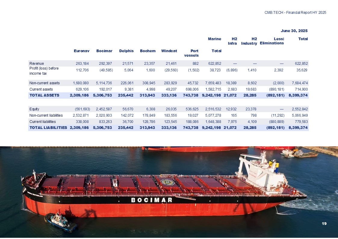 vessels  Revenue  263,184  292,397  21,571  23,357  21,461  882  622,852  —  —  —  622,852  Profit (loss) before 112,706 (49,585) 5,064 1,600 (29,560) (1,502) 38,723 (6,896) 1,410 2,392 35,629  income tax  Non-current assets  1,680,080  5,114,736  226,061  308,945  283,929  45,732  7,659,483  18,389  8,602  (2,000)  7,684,474  Current assets  629,106  192,017  9,381  4,998  49,207  698,006  1,582,715  2,683  19,683  (890,181)  714,900  TOTAL ASSETS  2,309,186  5,306,753  235,442  313,943  333,136  743,738  9,242,198  21,072  28,285  (892,181)  8,399,374  Equity  (561,693)  2,452,587  56,670  6,308  26,035  536,625  2,516,532  12,932  23,378  —  2,552,842  Non-current liabilities  2,532,871  2,020,903  142,072  178,849  183,556  19,027  5,077,278  165  798  (11,292)  5,066,949  Current liabilities  338,008  833,263  36,700  128,786  123,545  188,086  1,648,388  7,975  4,109  (880,889)  779,583  TOTAL LIABILITIES  2,309,186  5,306,753  235,442  313,943  333,136  743,738  9,242,198  21,072  28,285  (892,181)  8,399,374  June 30, 2025  Less: Total Eliminations  Marine  H2 H2  Infra Industry  Euronav  Bocimar  Delphis  Bochem  Windcat  Port  Total  CMB.TECH - Financial Report HY 2025  19