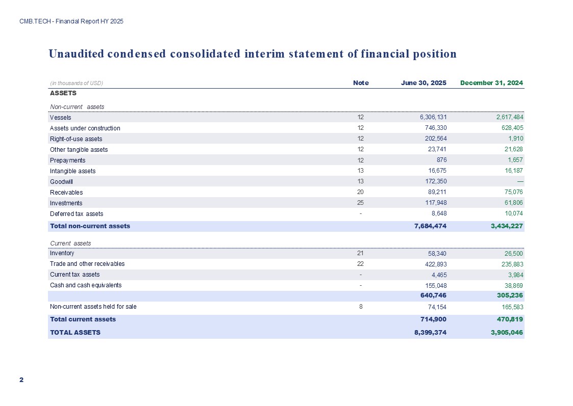 Unaudited condensed consolidated interim statement of financial position  (in thousands of USD)  Note  June 30, 2025  December 31, 2024  ASSETS  Non-current assets  Vessels  12  6,306,131  2,617,484  Assets under construction  12  746,330  628,405  Right-of-use assets  12  202,564  1,910  Other tangible assets  12  23,741  21,628  Prepayments  12  876  1,657  Intangible assets  13  16,675  16,187  Goodwill  13  172,350  —  Receivables  20  89,211  75,076  Investments  25  117,948  61,806  Deferred tax assets  -  8,648  10,074  Total non-current assets  7,684,474  3,434,227  Current assets  Inventory  21  58,340  26,500  Trade and other receivables  22  422,893  235,883  Current tax assets  -  4,465  3,984  Cash and cash equivalents  -  155,048  38,869  640,746  305,236  Non-current assets held for sale  8  74,154  165,583  Total current assets  714,900  470,819  TOTAL ASSETS  8,399,374  3,905,046  CMB.TECH - Financial Report HY 2025  2