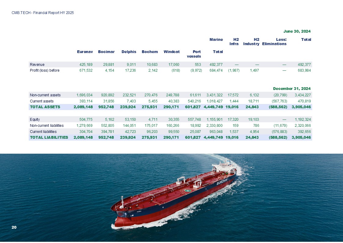 Marine  H2  Infra  H2  Industry  Less:  Eliminations  Total  Euronav  Bocimar  Delphis  Bochem  Windcat  Port vessels  Total  Revenue  425,189  29,881  9,011  10,683  17,060  553  492,377  —  —  —  492,377  Profit (loss) before  671,532  4,154  17,236  2,142  (618)  (9,972)  684,474  (1,987)  1,497  —  683,984  Non-current assets  1,696,034  920,892  232,521  270,476  249,788  61,611  3,431,322  17,572  6,132  (20,799)  3,434,227  Current assets  393,114  31,856  7,403  5,455  40,383  540,216  1,018,427  1,444  18,711  (567,763)  470,819  TOTAL ASSETS  2,089,148  952,748  239,924  275,931  290,171  601,827  4,449,749  19,016  24,843  (588,562)  3,905,046  Equity  504,775  5,162  53,150  4,711  30,355  557,748  1,155,901  17,320  19,103  —  1,192,324  Non-current liabilities  1,279,669  552,805  144,051  175,017  160,266  18,992  2,330,800  159  786  (11,679)  2,320,066  Current liabilities  304,704  394,781  42,723  96,203  99,550  25,087  963,048  1,537  4,954  (576,883)  392,656  TOTAL LIABILITIES  2,089,148  952,748  239,924  275,931  290,171  601,827  4,449,749  19,016  24,843  (588,562)  3,905,046  June 30, 2024  December 31, 2024  CMB.TECH - Financial Report HY 2025  20