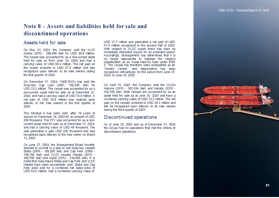 Note 8 - Assets and liabilities held for sale and discontinued operations  Assets held for sale  On May 21, 2024, the Company sold the VLCC Alsace (2012 - 299,999 dwt) for USD 96.9 million. The vessel was accounted for as a non-current asset held for sale as from June 30, 2024 and had a carrying value of USD 69.4 million. The net gain on the vessel amounts to USD 27.5 million and was recognized upon delivery to its new owners during the first quarter of 2025.  On December 31, 2024, CMB.TECH has sold the Suezmax Cap Lara (2007, 158,826 dwt) for USD 33.2 million. The vessel was accounted for as a non-current asset held for sale as at December 31, 2024, and had a carrying value of USD 14.4 million. A net gain of USD 18.8 million was realized upon delivery to her new owners in the first quarter of 2025.  The Windcat 6 has been sold, after 18 years of service on December 18, 2024 for an amount of USD 268 thousand. The CTV was accounted for as a non- current asset held for sale as at December 31, 2024, and had a carrying value of USD 48 thousand. The sale generated a gain USD 220 thousand and was recognized upon delivery to the new owner on March 13, 2025.  On June 27, 2024, the Management Board formally decided to commit to a plan to sell Suezmax vessels Statia (2006 - 150,205 dwt) and Cap Felix (2008 - 158,765 dwt) and VLCC vessels Hakata (2010 - 302,550 dwt) and Ingrid (2012 - 314,000 dwt). It is noted that Suezmaxes Statia and Cap Felix and VLCC Hakata have been successfully sold. Statia and Cap Felix were sold for a combined net sales price of USD 83.6 million, had a combined carrying value of  USD 31.7 million and generated a net gain of USD  51.9 million recognized in the second half of 2024. With respect to VLCC Ingrid, there has been no immediate interested buyers for an extended period. Accordingly, Management has determined that it is no longer appropriate to maintain the vessel’s classification as an ‘Asset Held for Sale’ under IFRS  5. The vessel has therefore been reclassified as an  ‘Owned Vessel,’ and depreciation has been recognized retroactively for the period from June 27, 2024, to June 30, 2025.  On April 16, 2025, the Company sold the VLCCs Hakone (2010 - 302,624 dwt) and Hakata (2010 - 302,550 dwt). Both vessels are accounted for as an asset held for sale as at June 30, 2025 and have a combined carrying value of USD 74.2 million. The net gain on the vessels amounts to USD 39.3 million and will be recognized upon delivery to its new owners during the third quarter of 2025.  Discontinued operations  As of June 30, 2025 and as of December 31, 2024 the Group had no operations that met the criteria of discontinued operations.  CMB.TECH - Financial Report HY 2025  21