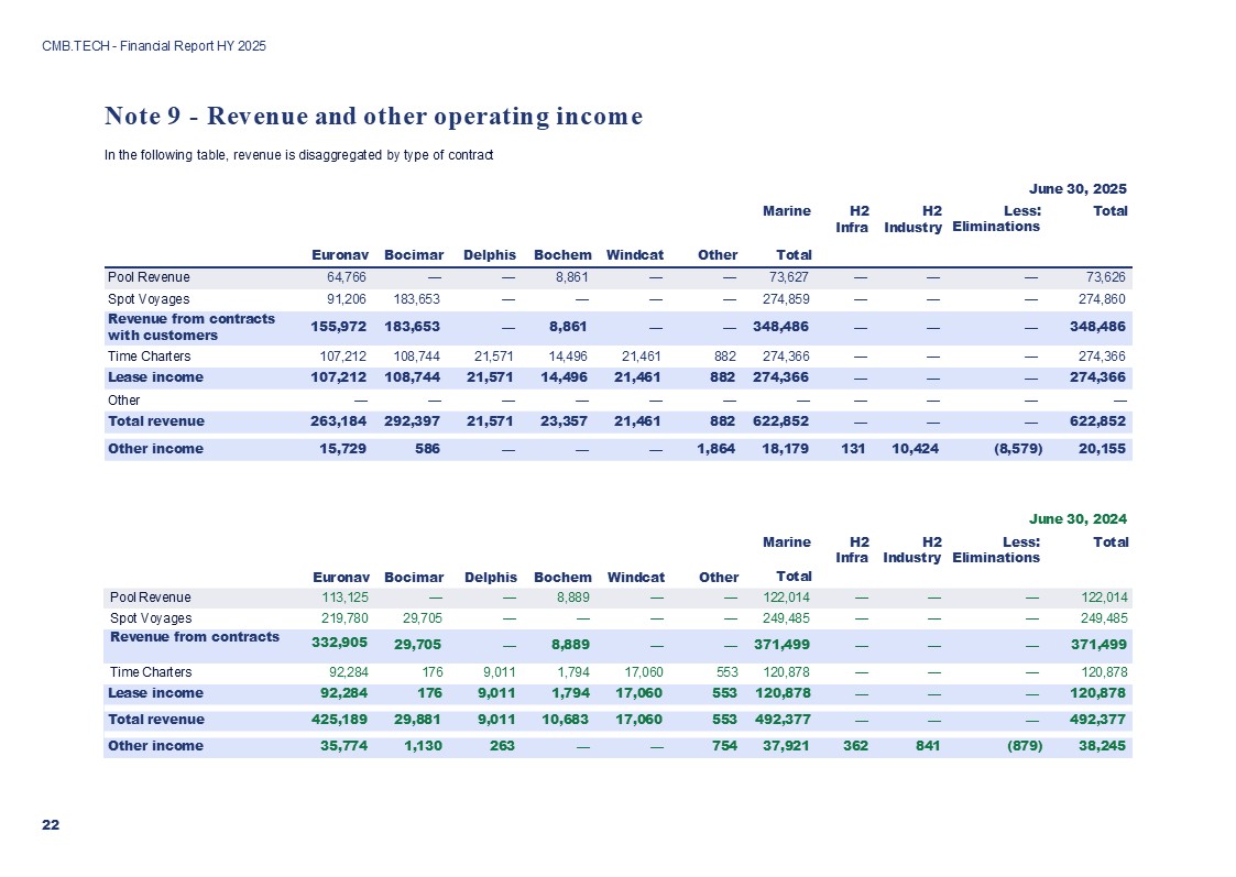 Note 9 - Revenue and other operating income  In the following table, revenue is disaggregated by type of contract  June 30, 2025  Less: Total Eliminations  Marine  H2 H2  Infra Industry  Euronav Bocimar Delphis Bochem Windcat Other Total  Pool Revenue 64,766 — — 8,861 — — 73,627 — — — 73,626  Spot Voyages 91,206 183,653 — — — — 274,859 — — — 274,860  Revenue from contracts with customers  155,972 183,653 — 8,861 — — 348,486 — — — 348,486  Time Charters 107,212 108,744 21,571 14,496 21,461 882 274,366 — — — 274,366  Lease income 107,212 108,744 21,571 14,496 21,461 882 274,366 — — — 274,366  Other — — — — — — — — — — —  Total revenue 263,184 292,397 21,571 23,357 21,461 882 622,852 — — — 622,852  Other income 15,729 586 — — — 1,864 18,179 131 10,424 (8,579) 20,155  Lease income  92,284  176  9,011  1,794  17,060  553  120,878  —  —  —  120,878  Total revenue  425,189  29,881  9,011  10,683  17,060  553  492,377  —  —  —  492,377  Other income  35,774  1,130  263  —  —  754  37,921  362  841  (879)  38,245  June 30, 2024  with customers  Euronav  Bocimar  Delphis  Bochem  Windcat  Other  Marine  Total  H2  Infra  H2  Industry  Less:  Eliminations  Total  Pool Revenue 113,125  —  —  8,889  —  —  122,014  —  —  —  122,014  Spot Voyages 219,780  29,705  —  —  —  —  249,485  —  —  —  249,485  Revenue from contracts 332,905  29,705  —  8,889  —  —  371,499  —  —  —  371,499  Time Charters 92,284  176  9,011  1,794  17,060  553  120,878  —  —  —  120,878  CMB.TECH - Financial Report HY 2025  22