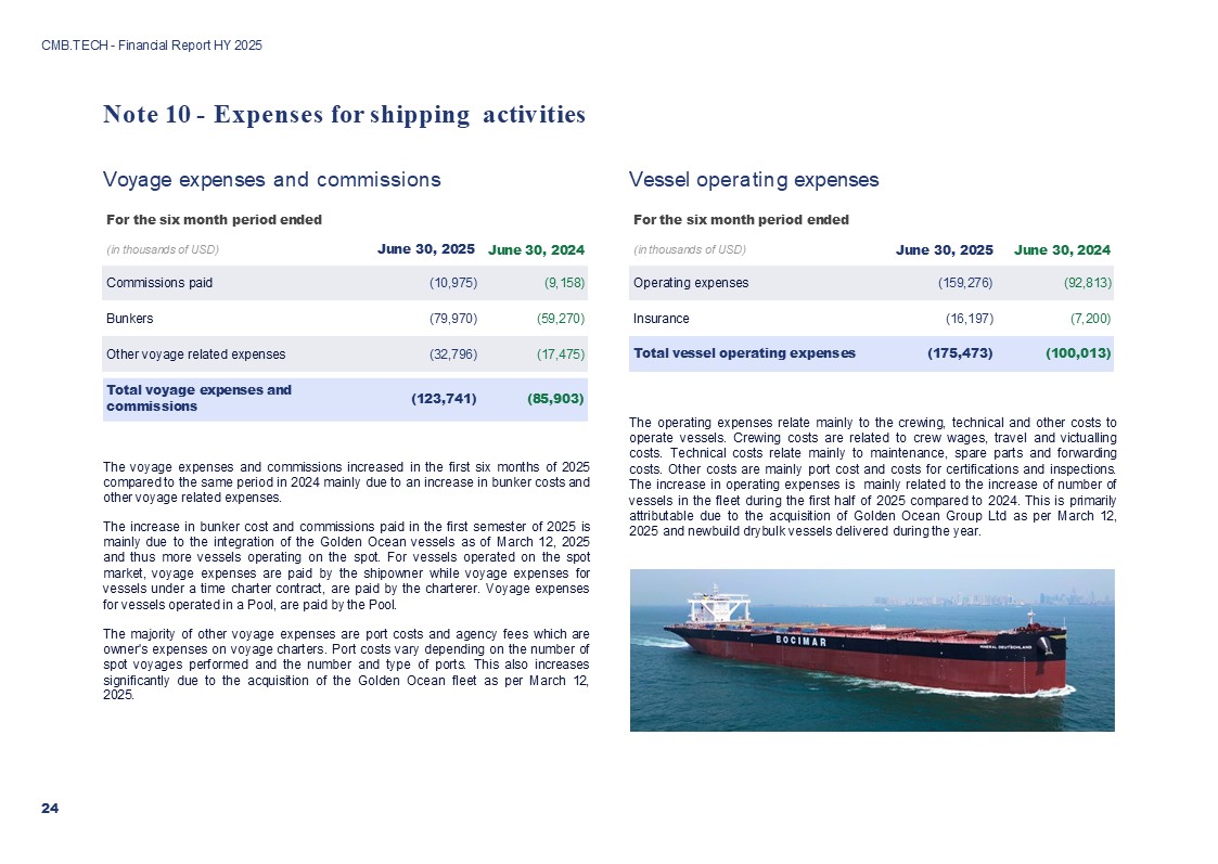 Note 10 - Expenses for shipping  activities  Voyage expenses and commissions  Vessel operating expenses  For the six month period ended  (in thousands of USD) June 30, 2025  June 30, 2024  For the six month period ended  (in thousands of USD)  June 30, 2025  June 30, 2024  Commissions paid (10,975)  (9,158)  Operating expenses  (159,276)  (92,813)  Bunkers (79,970)  (59,270)  Insurance  (16,197)  (7,200)  Other voyage related expenses (32,796)  (17,475)  Total vessel operating expenses  (175,473)  (100,013)  Total voyage expenses and commissions  (123,741)  (85,903)  The voyage expenses and commissions increased in the first six months of 2025 compared to the same period in 2024 mainly due to an increase in bunker costs and other voyage related expenses.  The increase in bunker cost and commissions paid in the first semester of 2025 is mainly due to the integration of the Golden Ocean vessels as of March 12, 2025 and thus more vessels operating on the spot. For vessels operated on the spot market, voyage expenses are paid by the shipowner while voyage expenses for vessels under a time charter contract, are paid by the charterer. Voyage expenses for vessels operated in a Pool, are paid by the Pool.  The majority of other voyage expenses are port costs and agency fees which are owner's expenses on voyage charters. Port costs vary depending on the number of spot voyages performed and the number and type of ports. This also increases significantly due to the acquisition of the Golden Ocean fleet as per March 12, 2025.  The operating expenses relate mainly to the crewing, technical and other costs to operate vessels. Crewing costs are related to crew wages, travel and victualling costs. Technical costs relate mainly to maintenance, spare parts and forwarding costs. Other costs are mainly port cost and costs for certifications and inspections. The increase in operating expenses is mainly related to the increase of number of vessels in the fleet during the first half of 2025 compared to 2024. This is primarily attributable due to the acquisition of Golden Ocean Group Ltd as per March 12, 2025 and newbuild drybulk vessels delivered during the year.  CMB.TECH - Financial Report HY 2025  24