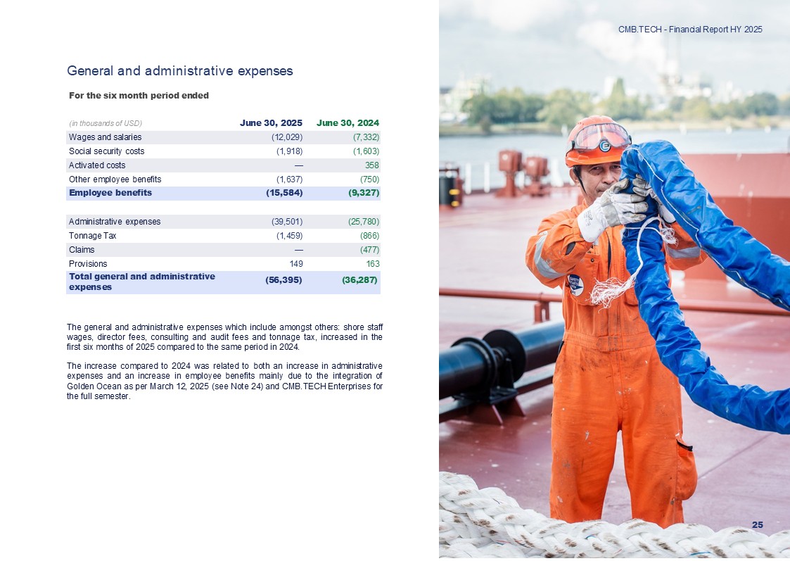 General and administrative expenses  For the six month period ended  (in thousands of USD)  June 30, 2025  June 30, 2024  Wages and salaries  (12,029)  (7,332)  Social security costs  (1,918)  (1,603)  Activated costs  —  358  Other employee benefits  (1,637)  (750)  Employee benefits  (15,584)  (9,327)  Administrative expenses  (39,501)  (25,780)  Tonnage Tax  (1,459)  (866)  Claims  —  (477)  Provisions  149  163  Total general and administrative (56,395) (36,287) expenses  The general and administrative expenses which include amongst others: shore staff wages, director fees, consulting and audit fees and tonnage tax, increased in the first six months of 2025 compared to the same period in 2024.  The increase compared to 2024 was related to both an increase in administrative expenses and an increase in employee benefits mainly due to the integration of Golden Ocean as per March 12, 2025 (see Note 24) and CMB.TECH Enterprises for the full semester.  CMB.TECH - Financial Report HY 2025  25