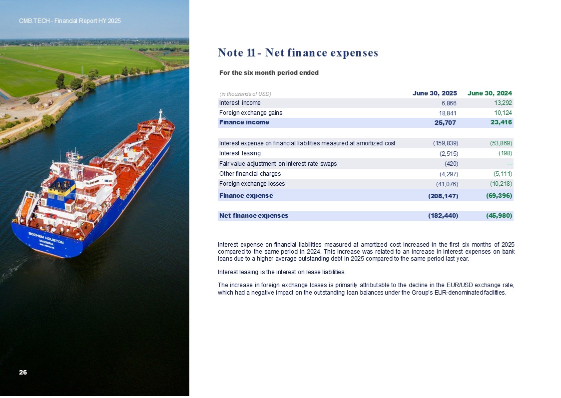 Note 11 - Net finance expenses  For the six month period ended  (in thousands of USD)  June 30, 2025  June 30, 2024  Interest income  6,866  13,292  Foreign exchange gains  18,841  10,124  Finance income  25,707  23,416  Interest expense on financial liabilities measured at amortized cost  (159,839)  (53,869)  Interest leasing  (2,515)  (198)  Fair value adjustment on interest rate swaps  (420)  —  Other financial charges  (4,297)  (5,111)  Foreign exchange losses  (41,076)  (10,218)  Finance expense  (208,147)  (69,396)  Net finance expenses  (182,440)  (45,980)  Interest expense on financial liabilities measured at amortized cost increased in the first six months of 2025 compared to the same period in 2024. This increase was related to an increase in interest expenses on bank loans due to a higher average outstanding debt in 2025 compared to the same period last year.  Interest leasing is the interest on lease liabilities.  The increase in foreign exchange losses is primarily attributable to the decline in the EUR/USD exchange rate, which had a negative impact on the outstanding loan balances under the Group’s EUR-denominated facilities.  CMB.TECH - Financial Report HY 2025  26