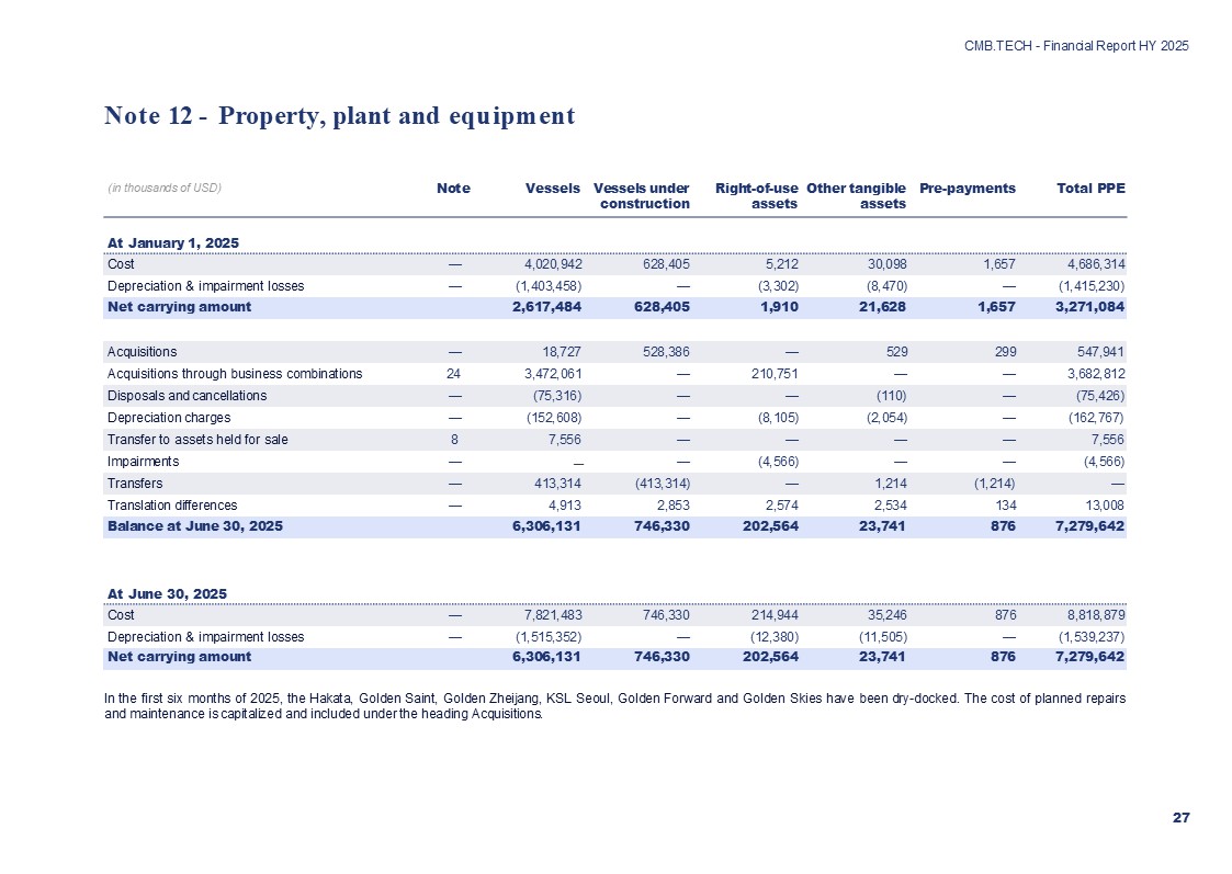 Note 12 - Property, plant and equipment  (in thousands of USD)  Note  Vessels  Vessels under  construction  Right-of-use  assets  Other tangible  assets  Pre-payments  Total PPE  At January 1, 2025  Cost  —  4,020,942  628,405  5,212  30,098  1,657  4,686,314  Depreciation & impairment losses  —  (1,403,458)  —  (3,302)  (8,470)  —  (1,415,230)  Net carrying amount  2,617,484  628,405  1,910  21,628  1,657  3,271,084  Acquisitions  —  18,727  528,386  —  529  299  547,941  Acquisitions through business combinations  24  3,472,061  —  210,751  —  —  3,682,812  Disposals and cancellations  —  (75,316)  —  —  (110)  —  (75,426)  Depreciation charges  —  (152,608)  —  (8,105)  (2,054)  —  (162,767)  Transfer to assets held for sale  8  7,556  —  —  —  —  7,556  Impairments  —  —  —  (4,566)  —  —  (4,566)  Transfers  —  413,314  (413,314)  —  1,214  (1,214)  —  Translation differences  —  4,913  2,853  2,574  2,534  134  13,008  Balance at June 30, 2025  6,306,131  746,330  202,564  23,741  876  7,279,642  At June 30, 2025  Cost  —  7,821,483  746,330  214,944  35,246  876  8,818,879  Depreciation & impairment losses  —  (1,515,352)  —  (12,380)  (11,505)  —  (1,539,237)  Net carrying amount  6,306,131  746,330  202,564  23,741  876  7,279,642  In the first six months of 2025, the Hakata, Golden Saint, Golden Zheijang, KSL Seoul, Golden Forward and Golden Skies have been dry-docked. The cost of planned repairs and maintenance is capitalized and included under the heading Acquisitions.  CMB.TECH - Financial Report HY 2025  27