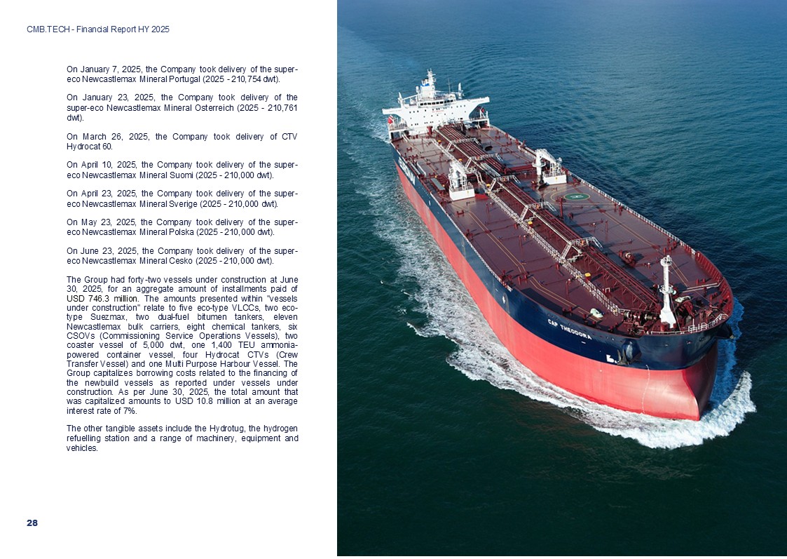 On January 7, 2025, the Company took delivery of the super- eco Newcastlemax Mineral Portugal (2025 - 210,754 dwt).  On January 23, 2025, the Company took delivery of the super-eco Newcastlemax Mineral Osterreich (2025 - 210,761 dwt).  On March 26, 2025, the Company took delivery of CTV Hydrocat 60.  On April 10, 2025, the Company took delivery of the super- eco Newcastlemax Mineral Suomi (2025 - 210,000 dwt).  On April 23, 2025, the Company took delivery of the super- eco Newcastlemax Mineral Sverige (2025 - 210,000 dwt).  On May 23, 2025, the Company took delivery of the super- eco Newcastlemax Mineral Polska (2025 - 210,000 dwt).  On June 23, 2025, the Company took delivery of the super- eco Newcastlemax Mineral Cesko (2025 - 210,000 dwt).  The Group had forty-two vessels under construction at June 30, 2025, for an aggregate amount of installments paid of USD 746.3 million. The amounts presented within "vessels under construction" relate to five eco-type VLCCs, two eco- type Suezmax, two dual-fuel bitumen tankers, eleven Newcastlemax bulk carriers, eight chemical tankers, six CSOVs (Commissioning Service Operations Vessels), two coaster vessel of 5,000 dwt, one 1,400 TEU ammonia- powered container vessel, four Hydrocat CTVs (Crew Transfer Vessel) and one Multi Purpose Harbour Vessel. The Group capitalizes borrowing costs related to the financing of the newbuild vessels as reported under vessels under construction. As per June 30, 2025, the total amount that was capitalized amounts to USD 10.8 million at an average interest rate of 7%.  The other tangible assets include the Hydrotug, the hydrogen refuelling station and a range of machinery, equipment and vehicles.  CMB.TECH - Financial Report HY 2025  28