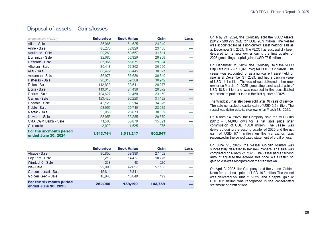 Disposal of assets – Gains/losses  (in thousands of USD)  Sale price  Book Value  Gain  Loss  Alice - Sale  85,965  61,625  24,340  —  Anne - Sale  86,275  62,820  23,455  —  Aquitaine - Sale  90,268  58,657  31,611  —  Dominica - Sale  82,685  52,826  29,859  —  Desirade - Sale  85,965  56,071  29,894  —  Alboran - Sale  86,418  56,362  30,056  —  Aral - Sale  86,472  56,445  30,027  —  Andaman - Sale  86,976  56,636  30,340  —  Hatteras - Sale  90,310  59,368  30,942  —  Delos - Sale  112,888  83,611  29,277  —  Doris - Sale  113,010  84,438  28,572  —  Derius - Sale  104,627  81,458  23,169  —  Camus - Sale  123,420  92,228  31,192  —  Oceania - Sale  43,120  8,294  34,826  —  Noble - Sale  53,955  25,716  28,239  —  Nectar - Sale  53,955  23,873  30,082  —  Newton - Sale  53,955  33,285  20,670  —  CMA CGM Baikal - Sale  71,500  55,879  15,621  —  Corporate  2,000  1,625  375  —  For the six month period ended June 30, 2024  1,513,764  1,011,217  502,547  —  Sale price  Book Value  Gain  Loss  Alsace - Sale  96,850  69,388  27,462  —  Cap Lara - Sale  33,213  14,437  18,776  —  Windcat 6 - Sale  268  48  220  —  Iris - Sale  99,990  42,857  57,133  —  Golden Ioanari - Sale  15,811  15,811  —  —  Golden Keen - Sale  16,848  16,649  199  —  For the six month period ended June 30, 2025  262,980  159,190  103,789  —  On May 21, 2024, the Company sold the VLCC Alsace (2012 - 299,999 dwt) for USD 96.9 million. The vessel was accounted for as a non-current asset held for sale as at December 31, 2024. The VLCC has successfully been delivered to its new owner during the first quarter of 2025 generating a capital gain of USD 27.5 million.  On December 31, 2024, the Company sold the VLCC Cap Lara (2007 - 158,826 dwt) for USD 33.2 million. The vessel was accounted for as a non-current asset held for sale as at December 31, 2024, and had a carrying value of USD 14.4 million. The vessel was delivered to her new owner on March 10, 2025, generating a net capital gain of USD 18.8 million and was recorded in the consolidated statement of profit or loss in the first quarter of 2025.  The Windcat 6 has also been sold, after 18 years of service. The sale generated a capital gain of USD 0.2 million. The vessel was delivered to its new owner on March 13, 2025.  On March 14, 2025, the Company sold the VLCC Iris (2012 - 314,000 dwt) for a net sale price after commission of USD 100.0 million. The vessel was delivered during the second quarter of 2025 and the net gain of USD 57.1 million on the transaction was recognized in the consolidated statement of profit or loss.  On June 25, 2025, the vessel Golden Ioanari was successfully delivered to her new owners. The sale was completed on March 21, 2025. The vessel had a carrying amount equal to the agreed sale price. As a result, no gain or loss was recognized on the transaction.  On April 3, 2025, the Company sold the vessel Golden Keen for a net sale price of USD 16.8 million. The vessel was delivered on June 2, 2025, and a capital gain of USD 0.2 million was recognized in the consolidated statement of profit or loss.  CMB.TECH - Financial Report HY 2025  29