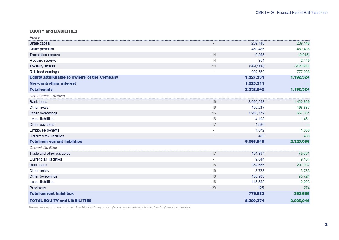 EQUITY and LIABILITIES  Equity  Share capital  -  239,148  239,148  Share premium  -  460,486  460,486  Translation reserve  14  9,285  (2,045)  Hedging reserve  14  351  2,145  Treasury shares  14  (284,508)  (284,508)  Retained earnings  -  902,569  777,098  Equity attributable to owners of the Company  1,327,331  1,192,324  Non-controlling interest  1,225,511  —  Total equity  2,552,842  1,192,324  Non-current liabilities  Bank loans  16  3,660,298  1,450,869  Other notes  16  199,217  198,887  Other borrowings  16  1,200,179  667,361  Lease liabilities  16  4,108  1,451  Other payables  17  1,580  —  Employee benefits  -  1,072  1,060  Deferred tax liabilities  -  495  438  Total non-current liabilities  5,066,949  2,320,066  Current liabilities  Trade and other payables  17  191,894  79,591  Current tax liabilities  -  9,644  9,104  Bank loans  16  352,666  201,937  Other notes  16  3,733  3,733  Other borrowings  16  105,933  95,724  Lease liabilities  16  115,588  2,293  Provisions  23  125  274  Total current liabilities  779,583  392,656  TOTAL EQUITY and LIABILITIES  8,399,374  3,905,046  The accompanying notes on pages 12 to 54 are an integral part of these condensed consolidated interim financial statements  CMB.TECH - Financial Report Half Year 2025  3