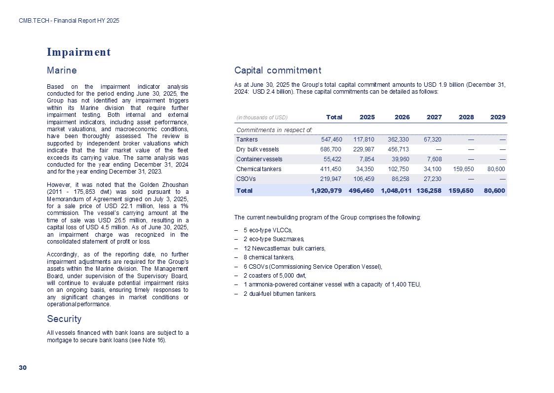Impairment  Marine  Based on the impairment indicator analysis conducted for the period ending June 30, 2025, the Group has not identified any impairment triggers within its Marine division that require further impairment testing. Both internal and external impairment indicators, including asset performance, market valuations, and macroeconomic conditions, have been thoroughly assessed. The review is supported by independent broker valuations which indicate that the fair market value of the fleet exceeds its carrying value. The same analysis was conducted for the year ending December 31, 2024 and for the year ending December 31, 2023.  However, it was noted that the Golden Zhoushan (2011 - 175,853 dwt) was sold pursuant to a Memorandum of Agreement signed on July 3, 2025, for a sale price of USD 22.1 million, less a 1% commission. The vessel’s carrying amount at the time of sale was USD 26.5 million, resulting in a capital loss of USD 4.5 million. As of June 30, 2025, an impairment charge was recognized in the consolidated statement of profit or loss.  Accordingly, as of the reporting date, no further impairment adjustments are required for the Group’s assets within the Marine division. The Management Board, under supervision of the Supervisory Board, will continue to evaluate potential impairment risks on an ongoing basis, ensuring timely responses to any significant changes in market conditions or operational performance.  Security  All vessels financed with bank loans are subject to a mortgage to secure bank loans (see Note 16).  Capital commitment  As at June 30, 2025 the Group's total capital commitment amounts to USD 1.9 billion (December 31, 2024: USD 2.4 billion). These capital commitments can be detailed as follows:  (in thousands of USD)  Total  2025  2026  2027  2028  2029  Commitments in respect of:  Tankers  547,460  117,810  362,330  67,320  —  —  Dry bulk vessels  686,700  229,987  456,713  —  —  —  Container vessels  55,422  7,854  39,960  7,608  —  —  Chemical tankers  411,450  34,350  102,750  34,100  159,650  80,600  CSOVs  219,947  106,459  86,258  27,230  —  —  Total  1,920,979  496,460  1,048,011  136,258  159,650  80,600  The current newbuilding program of the Group comprises the following:  5 eco-type VLCCs,  2 eco-type Suezmaxes,  12 Newcastlemax bulk carriers,  8 chemical tankers,  6 CSOVs (Commissioning Service Operation Vessel),  2 coasters of 5,000 dwt,  1 ammonia-powered container vessel with a capacity of 1,400 TEU,  2 dual-fuel bitumen tankers.  CMB.TECH - Financial Report HY 2025  30