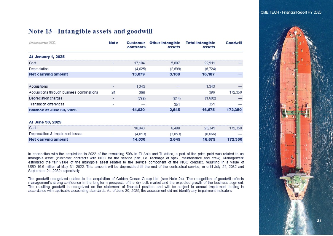 Note 13 - Intangible assets and goodwill  (in thousands USD)  Note  Customer  contracts  Other intangible  assets  Total intangible  assets  Goodwill  At January 1, 2025  Cost  -  17,104  5,807  22,911  —  Depreciation  -  (4,025)  (2,699)  (6,724)  —  Net carrying amount  13,079  3,108  16,187  —  Acquisitions  -  1,343  —  1,343  —  Acquisitions through business combinations  24  396  —  396  172,350  Depreciation charges  -  (788)  (814)  (1,602)  —  Translation differences  -  —  351  351  —  Balance at June 30, 2025  14,030  2,645  16,675  172,350  At June 30, 2025  Cost  -  18,843  6,498  25,341  172,350  Depreciation & impairment losses  -  (4,813)  (3,853)  (8,666)  —  Net carrying amount  14,030  2,645  16,675  172,350  In connection with the acquisition in 2022 of the remaining 50% in TI Asia and TI Africa, a part of the price paid was related to an intangible asset (customer contracts with NOC for the service part, i.e. recharge of opex, maintenance and crew). Management estimated the fair value of the intangible asset related to the service component of the NOC contract, resulting in a value of USD 16.6 million at May 31, 2022. This amount will be depreciated till the end of the contractual service, or until July 21, 2032 and September 21, 2032 respectively.  The goodwill recognized relates to the acquisition of Golden Ocean Group Ltd. (see Note 24). The recognition of goodwill reflects management’s strong confidence in the long-term prospects of the dry bulk market and the expected growth of the business segment. The resulting goodwill is recognized on the statement of financial position and will be subject to annual impairment testing in accordance with applicable accounting standards. As of June 30, 2025, the assessment did not identify any impairment indicators.  CMB.TECH - Financial Report HY 2025  31