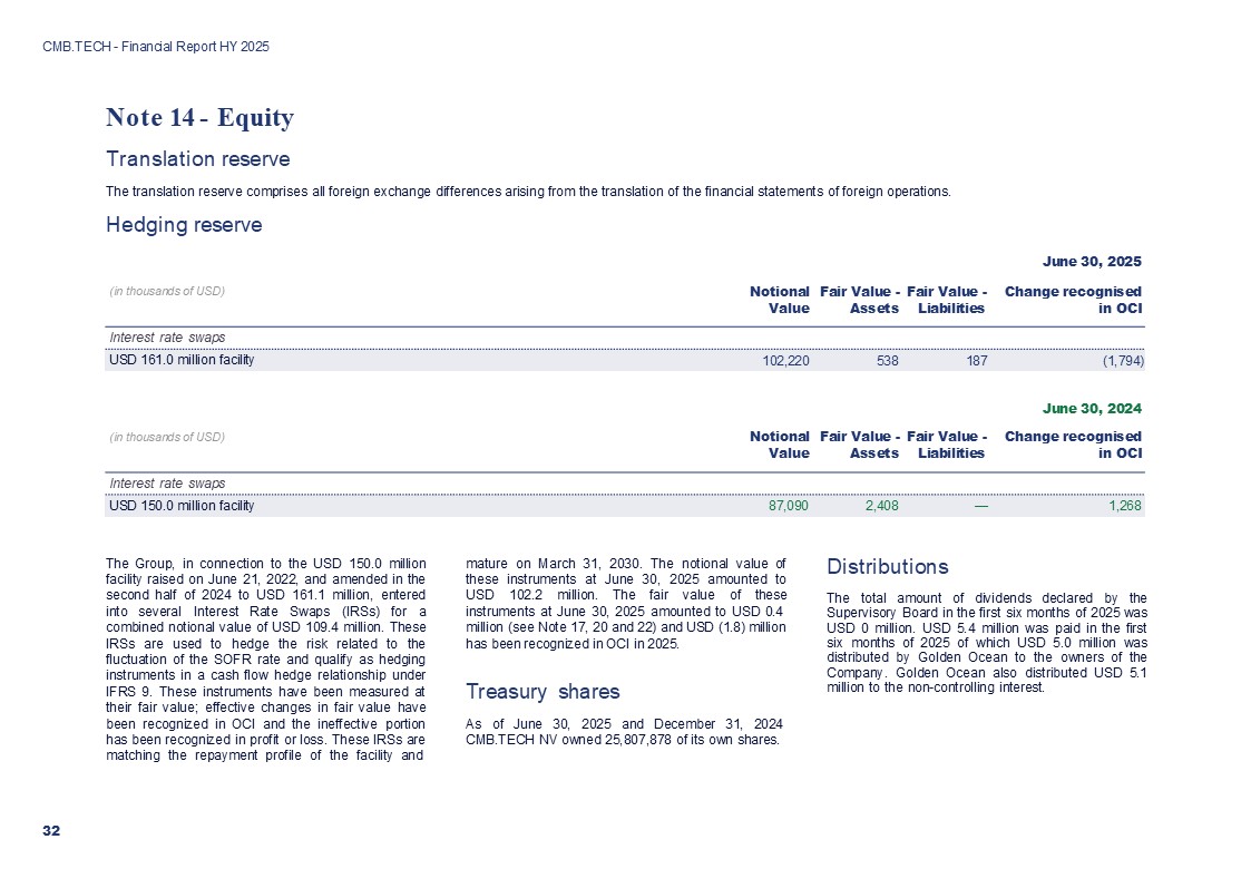 Note 14 - Equity  Translation reserve  The translation reserve comprises all foreign exchange differences arising from the translation of the financial statements of foreign operations.  Hedging reserve  June 30, 2025  (in thousands of USD)  Notional  Value  Fair Value -  Assets  Fair Value - Liabilities  Change recognised  in OCI  Interest rate swaps  USD 161.0 million facility  102,220  538  187  (1,794)  June 30, 2024  (in thousands of USD)  Notional  Value  Fair Value -  Assets  Fair Value - Liabilities  Change recognised  in OCI  Interest rate swaps  USD 150.0 million facility  87,090  2,408  —  1,268  The Group, in connection to the USD 150.0 million facility raised on June 21, 2022, and amended in the second half of 2024 to USD 161.1 million, entered into several Interest Rate Swaps (IRSs) for a combined notional value of USD 109.4 million. These IRSs are used to hedge the risk related to the fluctuation of the SOFR rate and qualify as hedging instruments in a cash flow hedge relationship under IFRS 9. These instruments have been measured at their fair value; effective changes in fair value have been recognized in OCI and the ineffective portion has been recognized in profit or loss. These IRSs are matching the repayment profile of the facility and  mature on March 31, 2030. The notional value of these instruments at June 30, 2025 amounted to USD 102.2 million. The fair value of these instruments at June 30, 2025 amounted to USD 0.4  million (see Note 17, 20 and 22) and USD (1.8) million has been recognized in OCI in 2025.  Treasury shares  As of June 30, 2025 and December 31, 2024 CMB.TECH NV owned 25,807,878 of its own shares.  Distributions  The total amount of dividends declared by the Supervisory Board in the first six months of 2025 was USD 0 million. USD 5.4 million was paid in the first six months of 2025 of which USD 5.0 million was distributed by Golden Ocean to the owners of the Company. Golden Ocean also distributed USD 5.1 million to the non-controlling interest.  CMB.TECH - Financial Report HY 2025  32