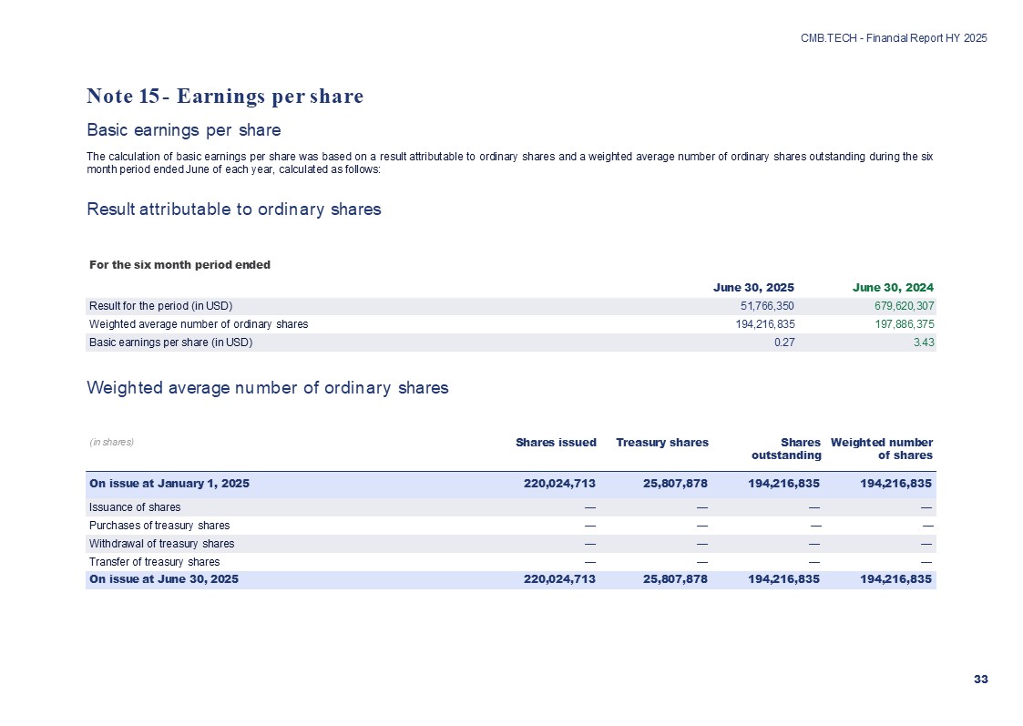 Note 15 - Earnings per share  Basic earnings per share  The calculation of basic earnings per share was based on a result attributable to ordinary shares and a weighted average number of ordinary shares outstanding during the six month period ended June of each year, calculated as follows:  Result attributable to ordinary shares  For the six month period ended  June 30, 2025  June 30, 2024  Result for the period (in USD)  51,766,350  679,620,307  Weighted average number of ordinary shares  194,216,835  197,886,375  Basic earnings per share (in USD)  0.27  3.43  Weighted average number of ordinary shares  (in shares)  Shares issued  Treasury shares  Shares  outstanding  Weighted number  of shares  On issue at January 1, 2025  220,024,713  25,807,878  194,216,835  194,216,835  Issuance of shares  —  —  —  —  Purchases of treasury shares  —  —  —  —  Withdrawal of treasury shares  —  —  —  —  Transfer of treasury shares  —  —  —  —  On issue at June 30, 2025  220,024,713  25,807,878  194,216,835  194,216,835  CMB.TECH - Financial Report HY 2025  33
