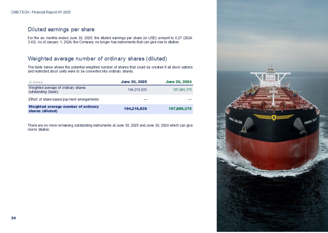 Diluted earnings per share  For the six months ended June 30, 2025, the diluted earnings per share (in USD) amount to 0.27 (2024: 3.43). As of January 1, 2024, the Company no longer has instruments that can give rise to dilution.  Weighted average number of ordinary shares (diluted)  The table below shows the potential weighted number of shares that could be created if all stock options and restricted stock units were to be converted into ordinary shares.  (in shares)  June 30, 2025  June 30, 2024  Weighted average of ordinary shares outstanding (basic)  194,216,835  197,886,375  Effect of share-based payment arrangements  —  —  Weighted average number of ordinary shares (diluted)  194,216,835  197,886,375  There are no more remaining outstanding instruments at June 30, 2025 and June 30, 2024 which can give rise to dilution.  CMB.TECH - Financial Report HY 2025  34