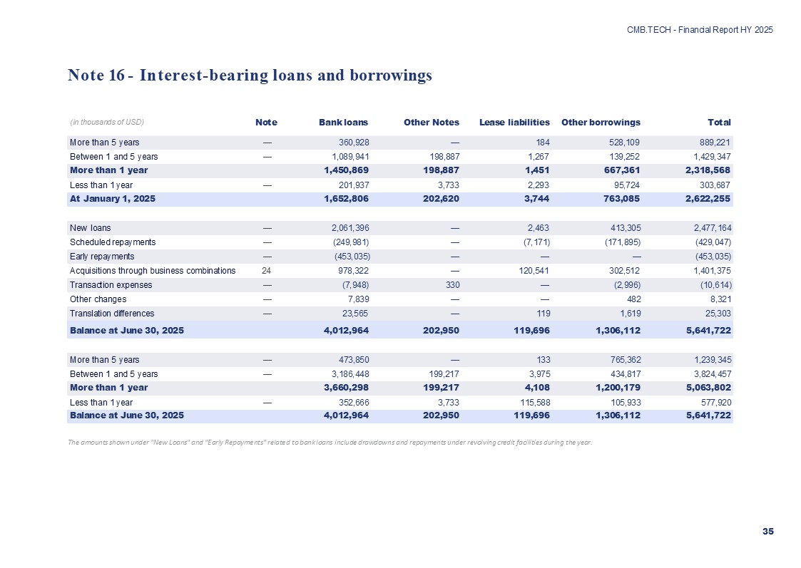 Note 16 - Interest-bearing loans and borrowings  (in thousands of USD)  Note  Bank loans  Other Notes  Lease liabilities  Other borrowings  Total  More than 5 years  —  360,928  —  184  528,109  889,221  Between 1 and 5 years  —  1,089,941  198,887  1,267  139,252  1,429,347  More than 1 year  1,450,869  198,887  1,451  667,361  2,318,568  Less than 1 year  —  201,937  3,733  2,293  95,724  303,687  At January 1, 2025  1,652,806  202,620  3,744  763,085  2,622,255  New loans  —  2,061,396  —  2,463  413,305  2,477,164  Scheduled repayments  —  (249,981)  —  (7,171)  (171,895)  (429,047)  Early repayments  —  (453,035)  —  —  —  (453,035)  Acquisitions through business combinations  24  978,322  —  120,541  302,512  1,401,375  Transaction expenses  —  (7,948)  330  —  (2,996)  (10,614)  Other changes  —  7,839  —  —  482  8,321  Translation differences  —  23,565  —  119  1,619  25,303  Balance at June 30, 2025  4,012,964  202,950  119,696  1,306,112  5,641,722  More than 5 years  —  473,850  —  133  765,362  1,239,345  Between 1 and 5 years  —  3,186,448  199,217  3,975  434,817  3,824,457  More than 1 year  3,660,298  199,217  4,108  1,200,179  5,063,802  Less than 1 year  —  352,666  3,733  115,588  105,933  577,920  Balance at June 30, 2025  4,012,964  202,950  119,696  1,306,112  5,641,722  The amounts shown under "New Loans" and "Early Repayments" related to bank loans include drawdowns and repayments under revolving credit facilities during the year.  CMB.TECH - Financial Report HY 2025  35