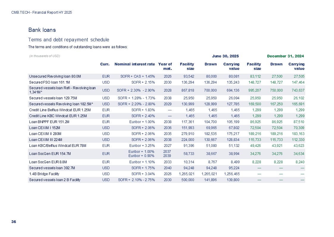 Bank loans  Terms and debt repayment schedule  The terms and conditions of outstanding loans were as follows:  (in thousands of USD)  June 30, 2025  December 31, 2024  Curr.  Nominal interest rate  Year of  mat.  Facility  size  Drawn  Carrying  value  Facility  size  Drawn  Carrying  value  Unsecured Revolving loan 80.0M  EUR  SOFR + CAS + 1.45%  2026  93,542  80,000  80,081  83,112  27,500  27,505  Secured FSO loan 161.1M  USD  SOFR + 2.15%  2030  136,294  136,294  135,243  148,727  148,727  147,464  Secured vessels loan Refi - Revolving loan 1,341M*  USD  SOFR + 2.30% - 2.90%  2028  867,818  700,000  694,136  995,207  750,000  743,637  Secured vessels loan 129.75M  USD  SOFR + 1.28% - 1.73%  2038  25,950  25,950  26,094  25,950  25,950  26,102  Secured vessels Revolving loan 182.5M*  USD  SOFR + 2.20% - 2.80%  2029  130,999  128,999  127,785  169,500  167,250  165,691  Credit Line Belfius Windcat EUR 1.25M  EUR  SOFR + 1.83%  —  1,465  1,465  1,465  1,299  1,299  1,299  Credit Line KBC Windcat EUR 1.25M  EUR  SOFR + 2.40%  —  1,465  1,465  1,465  1,299  1,299  1,299  Loan BNPPF EUR 151.2M  EUR  Euribor + 1.00%  2038  117,361  104,700  105,199  86,925  86,925  87,510  Loan CEXIM I 152M  USD  SOFR + 2.06%  2036  151,993  69,965  67,802  72,504  72,504  70,309  Loan CEXIM II 280M  USD  SOFR + 2.06%  2035  279,910  182,535  175,217  189,216  189,216  183,163  Loan CEXIM III 224M  USD  SOFR + 2.06%  2038  224,000  130,667  128,834  115,733  115,733  112,330  Loan KBC/Belfius Windcat EUR 78M  EUR  Euribor + 3.25%  2027  91,396  51,080  51,132  49,426  43,921  43,623  Loan SocGen EUR 154.7M  EUR  Euribor + 1.00%  Euribor + 0.90%  2037  2039  58,733  38,667  38,994  34,276  34,276  34,634  Loan SocGen EUR 8.8M  EUR  Euribor + 1.10%  2033  10,314  8,767  8,499  8,228  8,228  8,240  Secured vessels loan 392.7M  USD  SOFR + 1.75%  2040  94,248  94,248  95,224  —  —  —  1.4B Bridge Facility  USD  SOFR + 3.04%  2026  1,265,021  1,265,021  1,256,465  —  —  —  Secured vessels loan 2 B Facility  USD  SOFR + 2.10% - 2.75%  2030  500,000  141,896  139,800  —  —  —  CMB.TECH - Financial Report HY 2025  36