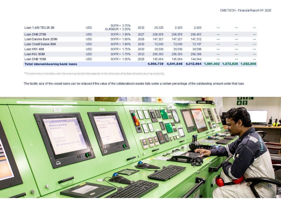 Loan 1,400 TEU 26.3M  USD  SOFR + 3.75%  EURIBOR + 3.55%  2032  26,325  2,025  2,025  —  —  —  Loan DNB 275M  USD  SOFR + 1.90%  2027  208,659  208,659  208,455  —  —  —  Loan Danske Bank 250M  USD  SOFR + 1.80%  2028  147,321  147,321  147,312  —  —  —  Loan Credit Suisse 80M  USD  SOFR + 1.80%  2030  72,000  72,000  72,197  —  —  —  Loan KfW 40M  USD  SOFR + 1.75%  2030  36,500  36,500  36,598  —  —  —  Loan ING 360M  USD  SOFR + 1.75%  2033  268,360  268,360  268,398  —  —  —  Loan DNB 150M  USD  SOFR + 1.65%  2029  145,064  145,064  144,544  —  —  —  Total interest-bearing bank loans  4,954,739  4,041,648  4,012,964  1,981,402  1,672,828  1,652,806  * The total amount available under the revolving loan facilities depends on the total value of the fleet of tankers securing the facility.  The facility size of the vessel loans can be reduced if the value of the collateralized vessels falls under a certain percentage of the outstanding amount under that loan.  CMB.TECH - Financial Report HY 2025  37