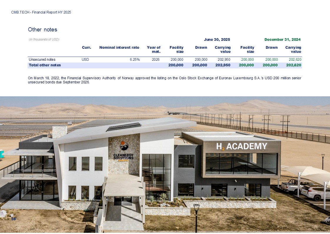 Other notes  Curr.  Nominal interest rate  Year of  mat.  Facility  size  Drawn  Carrying  value  Facility  size  Drawn  Carrying  value  Unsecured notes  USD  6.25%  2026  200,000  200,000  202,950  200,000  200,000  202,620  Total other notes  200,000  200,000  202,950  200,000  200,000  202,620  (in thousands of USD)  June 30, 2025  December 31, 2024  On March 18, 2022, the Financial Supervisory Authority of Norway approved the listing on the Oslo Stock Exchange of Euronav Luxembourg S.A.’s USD 200 million senior unsecured bonds due September 2026.  CMB.TECH - Financial Report HY 2025  38