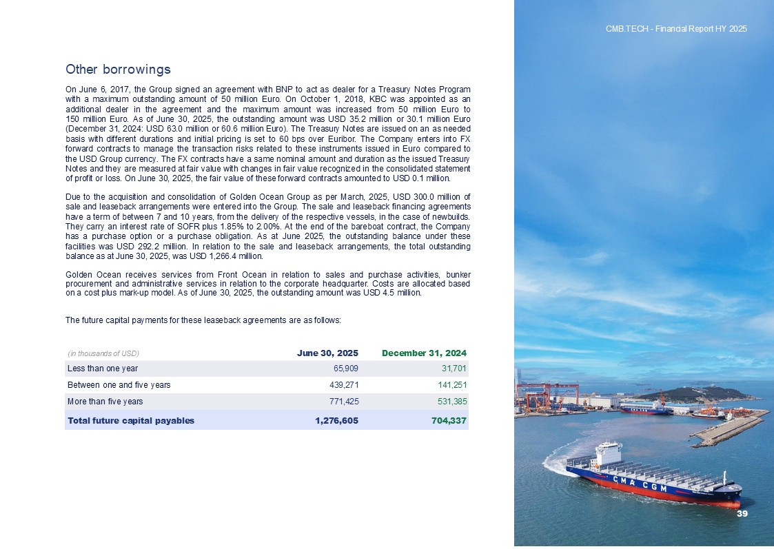 Other borrowings  On June 6, 2017, the Group signed an agreement with BNP to act as dealer for a Treasury Notes Program with a maximum outstanding amount of 50 million Euro. On October 1, 2018, KBC was appointed as an additional dealer in the agreement and the maximum amount was increased from 50 million Euro to 150 million Euro. As of June 30, 2025, the outstanding amount was USD 35.2 million or 30.1 million Euro (December 31, 2024: USD 63.0 million or 60.6 million Euro). The Treasury Notes are issued on an as needed basis with different durations and initial pricing is set to 60 bps over Euribor. The Company enters into FX forward contracts to manage the transaction risks related to these instruments issued in Euro compared to the USD Group currency. The FX contracts have a same nominal amount and duration as the issued Treasury Notes and they are measured at fair value with changes in fair value recognized in the consolidated statement of profit or loss. On June 30, 2025, the fair value of these forward contracts amounted to USD 0.1 million.  Due to the acquisition and consolidation of Golden Ocean Group as per March, 2025, USD 300.0 million of sale and leaseback arrangements were entered into the Group. The sale and leaseback financing agreements have a term of between 7 and 10 years, from the delivery of the respective vessels, in the case of newbuilds. They carry an interest rate of SOFR plus 1.85% to 2.00%. At the end of the bareboat contract, the Company has a purchase option or a purchase obligation. As at June 2025, the outstanding balance under these facilities was USD 292.2 million. In relation to the sale and leaseback arrangements, the total outstanding balance as at June 30, 2025, was USD 1,266.4 million.  Golden Ocean receives services from Front Ocean in relation to sales and purchase activities, bunker procurement and administrative services in relation to the corporate headquarter. Costs are allocated based on a cost plus mark-up model. As of June 30, 2025, the outstanding amount was USD 4.5 million.  The future capital payments for these leaseback agreements are as follows:  (in thousands of USD)  June 30, 2025  December 31, 2024  Less than one year  65,909  31,701  Between one and five years  439,271  141,251  More than five years  771,425  531,385  Total future capital payables  1,276,605  704,337  CMB.TECH - Financial Report HY 2025  39
