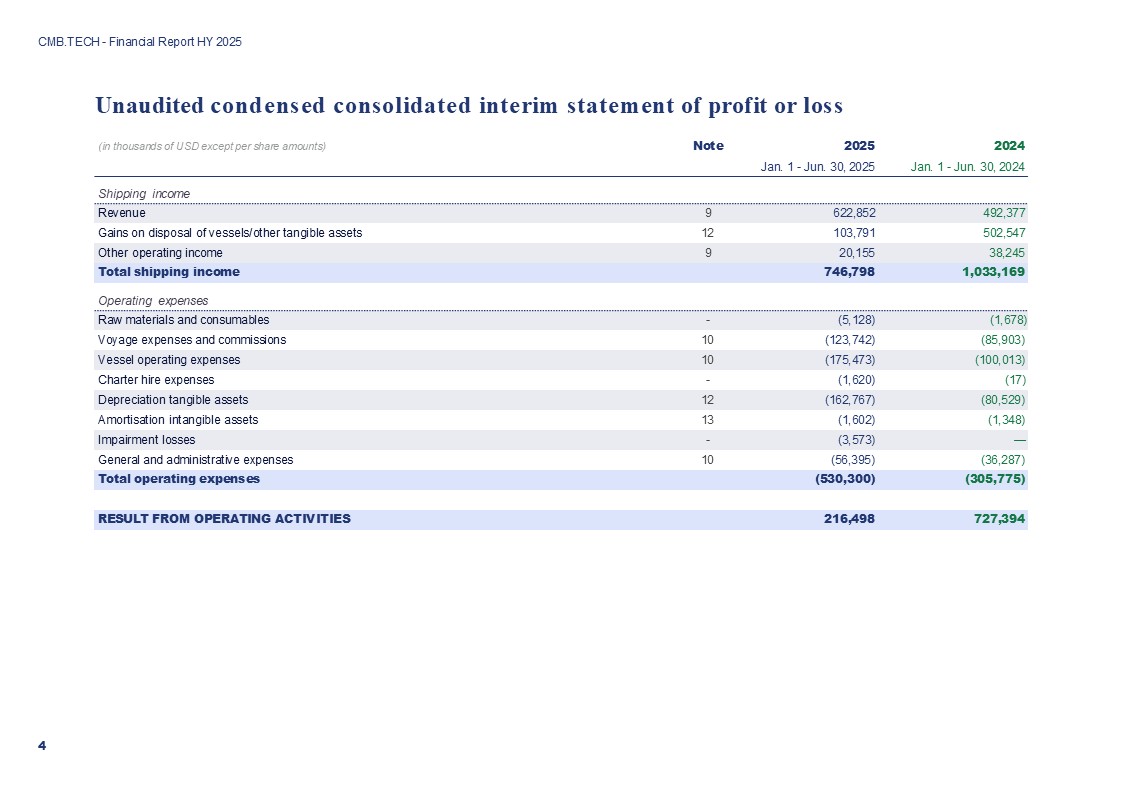 Unaudited condensed consolidated interim statement of profit or loss  (in thousands of USD except per share amounts)  Note  2025  2024  Jan. 1 - Jun. 30, 2025  Jan. 1 - Jun. 30, 2024  Shipping income  Revenue  9  622,852  492,377  Gains on disposal of vessels/other tangible assets  12  103,791  502,547  Other operating income  9  20,155  38,245  Total shipping income  746,798  1,033,169  Operating expenses  Raw materials and consumables  -  (5,128)  (1,678)  Voyage expenses and commissions  10  (123,742)  (85,903)  Vessel operating expenses  10  (175,473)  (100,013)  Charter hire expenses  -  (1,620)  (17)  Depreciation tangible assets  12  (162,767)  (80,529)  Amortisation intangible assets  13  (1,602)  (1,348)  Impairment losses  -  (3,573)  —  General and administrative expenses  10  (56,395)  (36,287)  Total operating expenses  (530,300)  (305,775)  RESULT FROM OPERATING ACTIVITIES  216,498  727,394  CMB.TECH - Financial Report HY 2025  4
