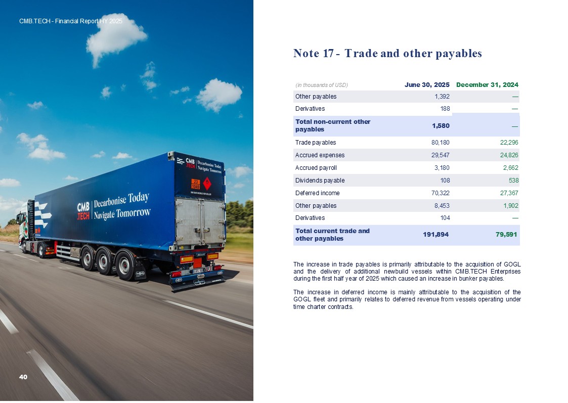 Note 17 - Trade and other payables  (in thousands of USD)  June 30, 2025  December 31, 2024  Other payables  1,392  —  Derivatives  188  —  Total non-current other payables  1,580  —  Trade payables  80,180  22,296  Accrued expenses  29,547  24,826  Accrued payroll  3,180  2,662  Dividends payable  108  538  Deferred income  70,322  27,367  Other payables  8,453  1,902  Derivatives  104  —  Total current trade and other payables  191,894  79,591  The increase in trade payables is primarily attributable to the acquisition of GOGL and the delivery of additional newbuild vessels within CMB.TECH Enterprises during the first half year of 2025 which caused an increase in bunker payables.  The increase in deferred income is mainly attributable to the acquisition of the GOGL fleet and primarily relates to deferred revenue from vessels operating under time charter contracts.  CMB.TECH - Financial Report HY 2025  40