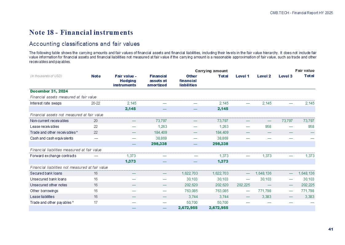 Note 18 - Financial instruments  Accounting classifications and fair values  The following table shows the carrying amounts and fair values of financial assets and financial liabilities, including their levels in the fair value hierarchy. It does not include fair value information for financial assets and financial liabilities not measured at fair value if the carrying amount is a reasonable approximation of fair value, such as trade and other receivables and payables.  Interest rate swaps 20-22  2,145  —  —  2,145  —  2,145  —  2,145  2,145  —  —  2,145  Financial assets not measured at fair value  Non-current receivables 20  —  73,797  —  73,797  —  —  73,797  73,797  Lease receivables 22  —  1,263  —  1,263  —  958  —  958  Trade and other receivables * 22  —  184,409  —  184,409  —  —  —  —  Cash and cash equivalents —  —  38,869  —  38,869  —  —  —  —  —  298,338  —  298,338  Financial liabilities measured at fair value  Forward exchange contracts —  1,373  —  —  1,373  —  1,373  —  1,373  1,373  —  —  1,373  Financial liabilities not measured at fair value  Secured bank loans 16  —  —  1,622,703  1,622,703  —  1,648,136  —  1,648,136  Unsecured bank loans 16  —  —  30,103  30,103  —  30,103  —  30,103  Unsecured other notes 16  —  —  202,620  202,620  202,225  —  —  202,225  Other borrowings 16  —  —  763,085  763,085  —  771,798  —  771,798  Lease liabilities 16  —  —  3,744  3,744  —  3,383  —  3,383  Trade and other payables * 17  —  —  50,700  50,700  —  —  —  —  —  —  2,672,955  2,672,955  Carrying amount  Fair value  Total  (in thousands of USD)  Note  Fair value - Hedging instruments  Financial assets at amortized  Other financial liabilities  Total  Level 1  Level 2  Level 3  December 31, 2024  Financial assets measured at fair value  CMB.TECH - Financial Report HY 2025  41