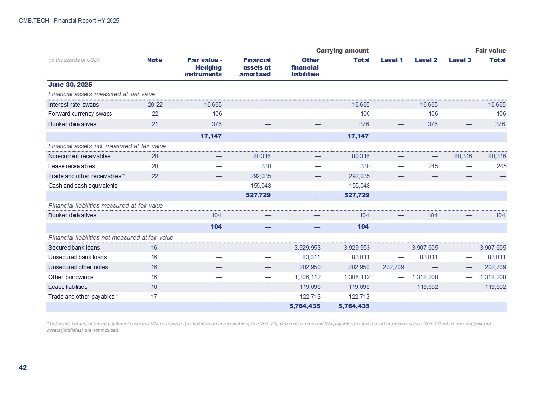 Interest rate swaps  20-22  16,665  — —  16,665  —  16,665  —  16,665  Forward currency swaps  22  106  — —  106  —  106  —  106  Bunker derivatives  21  376  —  —  376  —  376  —  376  17,147  —  —  17,147  Non-current receivables  20  —  80,316  —  80,316  — —  80,316  80,316  Lease receivables  20  —  330  —  330  — 245  —  245  Trade and other receivables *  22  —  292,035  —  292,035  — —  —  —  Cash and cash equivalents  —  —  155,048  —  155,048  — —  —  —  —  527,729  —  527,729  Bunker derivatives  104  —  —  104  —  104  —  104  104  —  —  104  Secured bank loans  16  — —  3,929,953  3,929,953  —  3,907,605  — 3,907,605  Unsecured bank loans  16  — —  83,011  83,011  —  83,011  — 83,011  Unsecured other notes  16  — —  202,950  202,950  202,709  —  — 202,709  Other borrowings  16  — —  1,306,112  1,306,112  —  1,318,208  — 1,318,208  Lease liabilities  16  — —  119,696  119,696  —  119,652  — 119,652  Trade and other payables *  17  — —  122,713  122,713  —  —  — —  — —  5,764,435  5,764,435  Carrying amount  Fair value  Total  (in thousands of USD)  Note  Fair value - Hedging instruments  Financial assets at amortized  Other financial liabilities  Total  Level 1  Level 2  Level 3  June 30, 2025  Financial assets measured at fair value  Financial assets not measured at fair value  Financial liabilities measured at fair value  Financial liabilities not measured at fair value  * Deferred charges, deferred fulfillment costs and VAT receivables (included in other receivables) (see Note 22), deferred income and VAT payables (included in other payables) (see Note 17), which are not financial assets (liabilities) are not included.  CMB.TECH - Financial Report HY 2025  42