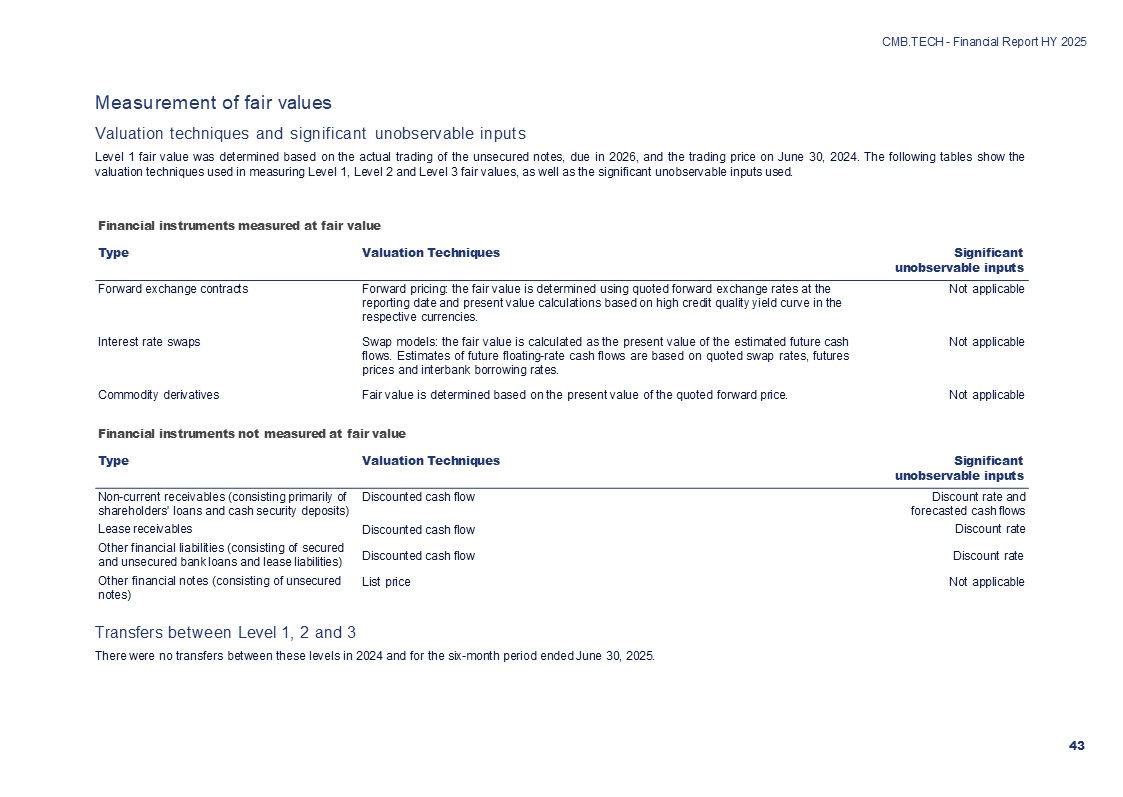 CMB.TECH - Financial Report HY 2025  Measurement of fair values  Valuation techniques and significant unobservable inputs  Level 1 fair value was determined based on the actual trading of the unsecured notes, due in 2026, and the trading price on June 30, 2024. The following tables show the valuation techniques used in measuring Level 1, Level 2 and Level 3 fair values, as well as the significant unobservable inputs used.  Financial instruments measured at fair value  Type Valuation Techniques  Significant unobservable inputs  Forward exchange contracts  Forward pricing: the fair value is determined using quoted forward exchange rates at the reporting date and present value calculations based on high credit quality yield curve in the respective currencies.  Not applicable  Interest rate swaps  Swap models: the fair value is calculated as the present value of the estimated future cash flows. Estimates of future floating-rate cash flows are based on quoted swap rates, futures prices and interbank borrowing rates.  Not applicable  Commodity derivatives  Fair value is determined based on the present value of the quoted forward price.  Not applicable  Financial instruments not measured at fair value  Type Valuation Techniques  Significant unobservable inputs  Discounted cash flow  Discount rate and forecasted cash flows  Discount rate  Non-current receivables (consisting primarily of shareholders' loans and cash security deposits)  Lease receivables  Other financial liabilities (consisting of secured and unsecured bank loans and lease liabilities)  Other financial notes (consisting of unsecured notes)  Discounted cash flow  Discounted cash flow  Discount rate  List price  Not applicable  Transfers between Level 1, 2 and 3  There were no transfers between these levels in 2024 and for the six-month period ended June 30, 2025.  43