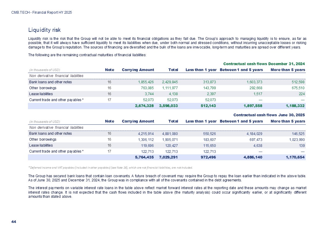 Liquidity risk  Liquidity risk is the risk that the Group will not be able to meet its financial obligations as they fall due. The Group’s approach to managing liquidity is to ensure, as far as possible, that it will always have sufficient liquidity to meet its liabilities when due, under both normal and stressed conditions, without incurring unacceptable losses or risking damage to the Group’s reputation. The sources of financing are diversified and the bulk of the loans are irrevocable, long-term and maturities are spread over different years.  The following are the remaining contractual maturities of financial liabilities:  Contractual cash flows December 31, 2024  (in thousands of USD)  Note  Carrying Amount  Total  Less than 1 year  Between 1 and 5 years  More than 5 years  Non derivative financial liabilities  Bank loans and other notes  16  1,855,426  2,429,845  313,873  1,603,373  512,598  Other borrowings  16  763,085  1,111,977  143,799  292,668  675,510  Lease liabilities  16  3,744  4,138  2,397  1,517  224  Current trade and other payables *  17  52,073  52,073  52,073  —  —  2,674,328  3,598,033  512,143  1,897,558  1,188,332  Contractual cash flows June 30, 2025  (in thousands of USD)  Note  Carrying Amount  Total  Less than 1 year  Between 1 and 5 years  More than 5 years  Non derivative financial liabilities  Bank loans and other notes  16  4,215,914  4,881,080  550,526  4,184,029  146,525  Other borrowings  16  1,306,112  1,905,071  183,607  697,473  1,023,990  Lease liabilities  16  119,696  120,427  115,650  4,638  139  Current trade and other payables *  17  122,713  122,713  122,713  —  —  5,764,435  7,029,291  972,496  4,886,140  1,170,654  * Deferred income and VAT payables (included in other payables) (see Note 16), which are not financial liabilities, are not included.  The Group has secured bank loans that contain loan covenants. A future breach of covenant may require the Group to repay the loan earlier than indicated in the above table. As of June 30, 2025 and December 31, 2024, the Group was in compliance with all of the covenants contained in the debt agreements.  The interest payments on variable interest rate loans in the table above reflect market forward interest rates at the reporting date and these amounts may change as market interest rates change. It is not expected that the cash flows included in the table above (the maturity analysis) could occur significantly earlier, or at significantly different amounts than stated above.  CMB.TECH - Financial Report HY 2025  44