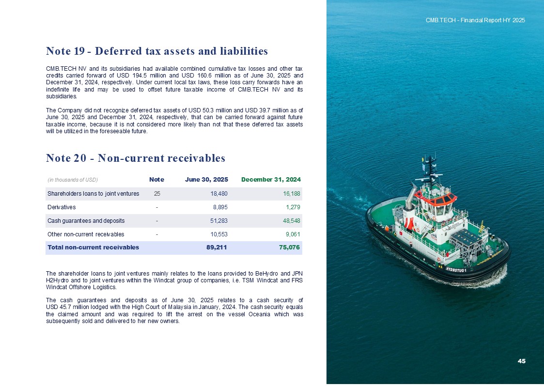 Note 19 - Deferred tax assets and liabilities  CMB.TECH NV and its subsidiaries had available combined cumulative tax losses and other tax credits carried forward of USD 194.5 million and USD 160.6 million as of June 30, 2025 and December 31, 2024, respectively. Under current local tax laws, these loss carry forwards have an indefinite life and may be used to offset future taxable income of CMB.TECH NV and its subsidiaries.  The Company did not recognize deferred tax assets of USD 50.3 million and USD 39.7 million as of June 30, 2025 and December 31, 2024, respectively, that can be carried forward against future taxable income, because it is not considered more likely than not that these deferred tax assets will be utilized in the foreseeable future.  Note 20 - Non-current receivables  (in thousands of USD)  Note  June 30, 2025  December 31, 2024  Shareholders loans to joint ventures  25  18,480  16,188  Derivatives  -  8,895  1,279  Cash guarantees and deposits  -  51,283  48,548  Other non-current receivables  -  10,553  9,061  Total non-current receivables  89,211  75,076  The shareholder loans to joint ventures mainly relates to the loans provided to BeHydro and JPN H2Hydro and to joint ventures within the Windcat group of companies, i.e. TSM Windcat and FRS Windcat Offshore Logistics.  The cash guarantees and deposits as of June 30, 2025 relates to a cash security of USD 45.7 million lodged with the High Court of Malaysia in January, 2024. The cash security equals the claimed amount and was required to lift the arrest on the vessel Oceania which was subsequently sold and delivered to her new owners.  CMB.TECH - Financial Report HY 2025  45