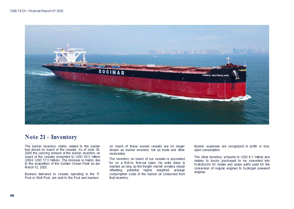 Note 21 - Inventory  The bunker inventory mainly relates to the bunker fuel stored on board of the vessels. As of June 30, 2025 the carrying amount of the bunker inventory on board of the vessels amounted to USD 50.3 million (2024: USD 17.3 million). The increase is mainly due to the acquisition of the Golden Ocean Fleet as per March 12, 2025.  Bunkers delivered to vessels operating in the TI Pool or Stolt Pool, are sold to the Pool and bunkers  on board of these pooled vessels are no longer shown as bunker inventory but as trade and other receivables.  The inventory on board of our vessels is accounted for on a first-in, first-out basis. No write down is needed as long as the freight market remains robust offsetting potential higher weighted average consumption costs of the bunker oil consumed from that inventory.  Bunker expenses are recognized in profit or loss upon consumption.  The other inventory amounts to USD 8.1 million and relates to trucks purchased to be converted into hydrotrucks for resale and spare parts used for the conversion of regular engines to hydrogen powered engines.  CMB.TECH - Financial Report HY 2025  46