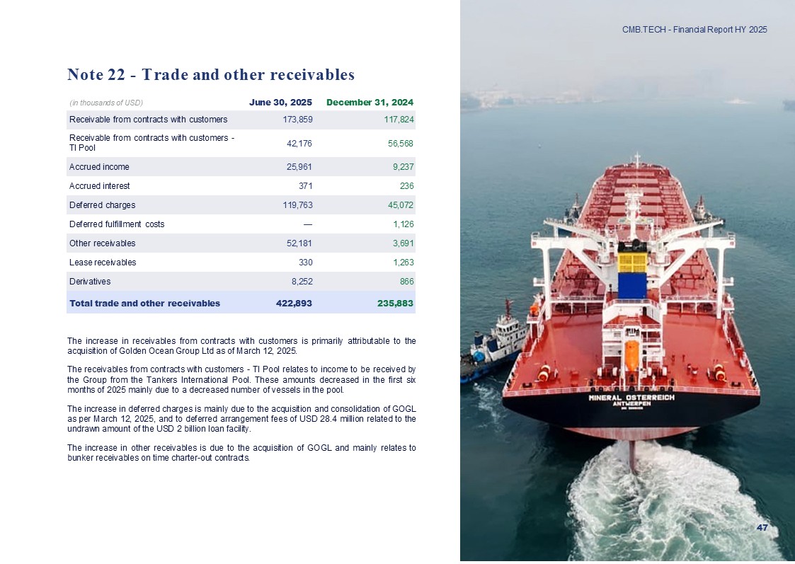 Note 22 - Trade and other receivables  (in thousands of USD)  June 30, 2025  December 31, 2024  Receivable from contracts with customers  173,859  117,824  Receivable from contracts with customers - TI Pool  42,176  56,568  Accrued income  25,961  9,237  Accrued interest  371  236  Deferred charges  119,763  45,072  Deferred fulfillment costs  —  1,126  Other receivables  52,181  3,691  Lease receivables  330  1,263  Derivatives  8,252  866  Total trade and other receivables  422,893  235,883  The increase in receivables from contracts with customers is primarily attributable to the acquisition of Golden Ocean Group Ltd as of March 12, 2025.  The receivables from contracts with customers - TI Pool relates to income to be received by the Group from the Tankers International Pool. These amounts decreased in the first six months of 2025 mainly due to a decreased number of vessels in the pool.  The increase in deferred charges is mainly due to the acquisition and consolidation of GOGL as per March 12, 2025, and to deferred arrangement fees of USD 28.4 million related to the undrawn amount of the USD 2 billion loan facility.  The increase in other receivables is due to the acquisition of GOGL and mainly relates to bunker receivables on time charter-out contracts.  CMB.TECH - Financial Report HY 2025  47