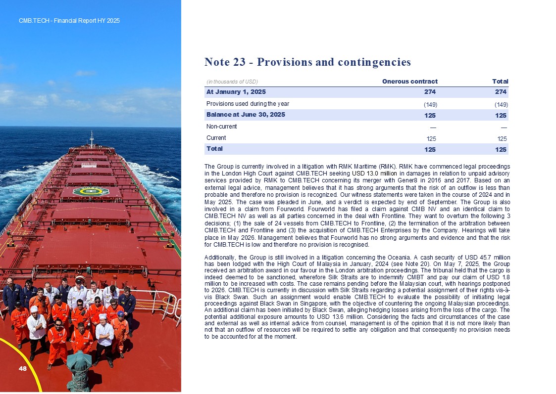 Note 23 - Provisions and contingencies  (in thousands of USD)  Onerous contract  Total  At January 1, 2025  274  274  Provisions used during the year  (149)  (149)  Balance at June 30, 2025  125  125  Non-current  —  —  Current  125  125  Total  125  125  The Group is currently involved in a litigation with RMK Maritime (RMK). RMK have commenced legal proceedings in the London High Court against CMB.TECH seeking USD 13.0 million in damages in relation to unpaid advisory services provided by RMK to CMB.TECH concerning its merger with Gener8 in 2016 and 2017. Based on an external legal advice, management believes that it has strong arguments that the risk of an outflow is less than probable and therefore no provision is recognized. Our witness statements were taken in the course of 2024 and in May 2025. The case was pleaded in June, and a verdict is expected by end of September. The Group is also involved in a claim from Fourworld. Fourworld has filed a claim against CMB NV and an identical claim to CMB.TECH NV as well as all parties concerned in the deal with Frontline. They want to overturn the following 3 decisions; (1) the sale of 24 vessels from CMB.TECH to Frontline, (2) the termination of the arbitration between CMB.TECH and Frontline and (3) the acquisition of CMB.TECH Enterprises by the Company. Hearings will take place in May 2026. Management believes that Fourworld has no strong arguments and evidence and that the risk for CMB.TECH is low and therefore no provision is recognised.  Additionally, the Group is still involved in a litigation concerning the Oceania. A cash security of USD 45.7 million has been lodged with the High Court of Malaysia in January, 2024 (see Note 20). On May 7, 2025, the Group received an arbitration award in our favour in the London arbitration proceedings. The tribunal held that the cargo is indeed deemed to be sanctioned, wherefore Silk Straits are to indemnify CMBT and pay our claim of USD 1.8 million to be increased with costs. The case remains pending before the Malaysian court, with hearings postponed to 2026. CMB.TECH is currently in discussion with Silk Straits regarding a potential assignment of their rights vis-à- vis Black Swan. Such an assignment would enable CMB.TECH to evaluate the possibility of initiating legal proceedings against Black Swan in Singapore, with the objective of countering the ongoing Malaysian proceedings. An additional claim has been initiated by Black Swan, alleging hedging losses arising from the loss of the cargo. The potential additional exposure amounts to USD 13.6 million. Considering the facts and circumstances of the case and external as well as internal advice from counsel, management is of the opinion that it is not more likely than not that an outflow of resources will be required to settle any obligation and that consequently no provision needs to be accounted for at the moment.  CMB.TECH - Financial Report HY 2025  48