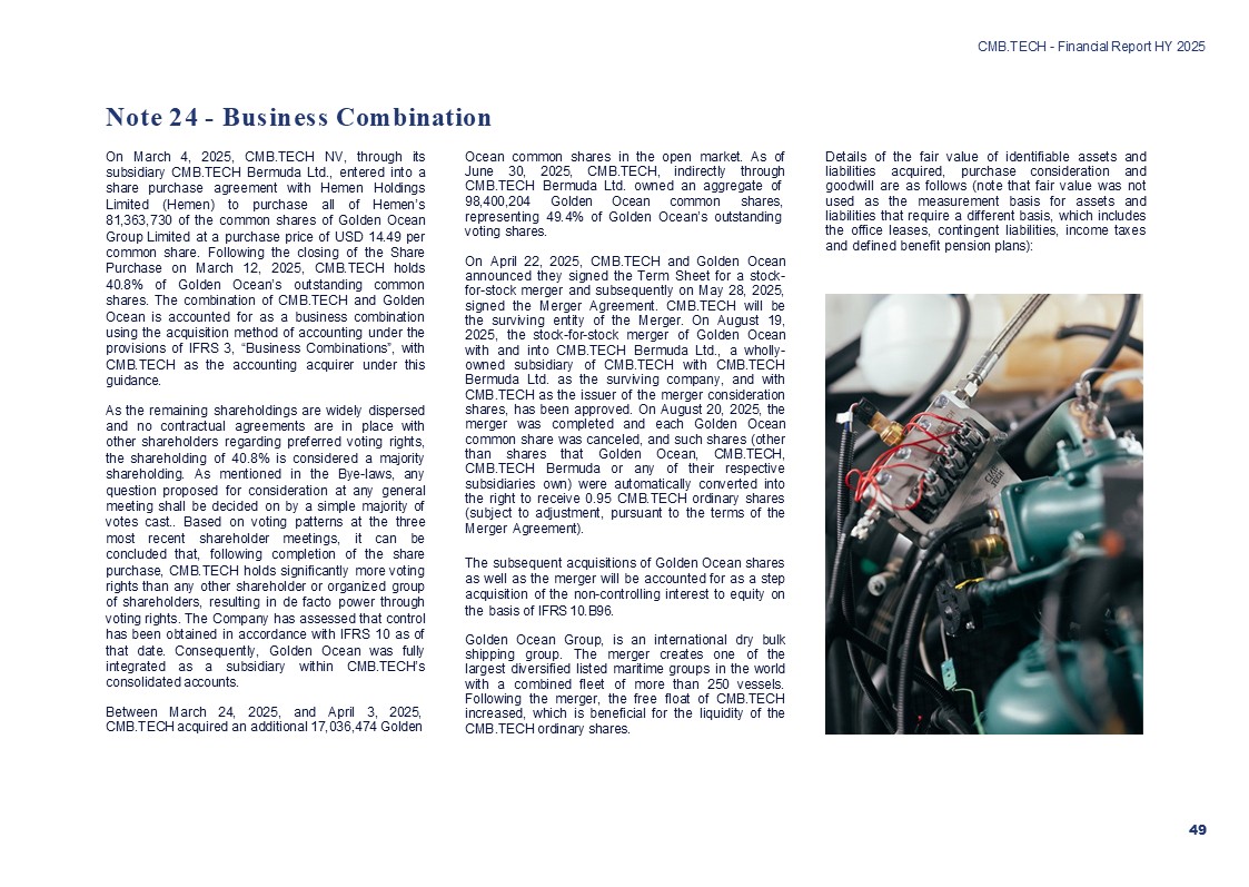 Note 24 - Business Combination  On March 4, 2025, CMB.TECH NV, through its subsidiary CMB.TECH Bermuda Ltd., entered into a share purchase agreement with Hemen Holdings Limited (Hemen) to purchase all of Hemen’s 81,363,730 of the common shares of Golden Ocean Group Limited at a purchase price of USD 14.49 per common share. Following the closing of the Share Purchase on March 12, 2025, CMB.TECH holds 40.8% of Golden Ocean’s outstanding common shares. The combination of CMB.TECH and Golden Ocean is accounted for as a business combination using the acquisition method of accounting under the provisions of IFRS 3, “Business Combinations”, with CMB.TECH as the accounting acquirer under this guidance.  As the remaining shareholdings are widely dispersed and no contractual agreements are in place with other shareholders regarding preferred voting rights, the shareholding of 40.8% is considered a majority shareholding. As mentioned in the Bye-laws, any question proposed for consideration at any general meeting shall be decided on by a simple majority of votes cast.. Based on voting patterns at the three most recent shareholder meetings, it can be concluded that, following completion of the share purchase, CMB.TECH holds significantly more voting rights than any other shareholder or organized group of shareholders, resulting in de facto power through voting rights. The Company has assessed that control has been obtained in accordance with IFRS 10 as of that date. Consequently, Golden Ocean was fully integrated as a subsidiary within CMB.TECH’s consolidated accounts.  Between March 24, 2025, and April 3, 2025, CMB.TECH acquired an additional 17,036,474 Golden  Ocean common shares in the open market. As of June 30, 2025, CMB.TECH, indirectly through CMB.TECH Bermuda Ltd. owned an aggregate of  98,400,204 Golden Ocean common shares,  representing 49.4% of Golden Ocean’s outstanding voting shares.  On April 22, 2025, CMB.TECH and Golden Ocean announced they signed the Term Sheet for a stock- for-stock merger and subsequently on May 28, 2025, signed the Merger Agreement. CMB.TECH will be the surviving entity of the Merger. On August 19, 2025, the stock-for-stock merger of Golden Ocean with and into CMB.TECH Bermuda Ltd., a wholly- owned subsidiary of CMB.TECH with CMB.TECH Bermuda Ltd. as the surviving company, and with CMB.TECH as the issuer of the merger consideration shares, has been approved. On August 20, 2025, the merger was completed and each Golden Ocean common share was canceled, and such shares (other than shares that Golden Ocean, CMB.TECH, CMB.TECH Bermuda or any of their respective subsidiaries own) were automatically converted into the right to receive 0.95 CMB.TECH ordinary shares (subject to adjustment, pursuant to the terms of the Merger Agreement).  The subsequent acquisitions of Golden Ocean shares as well as the merger will be accounted for as a step acquisition of the non-controlling interest to equity on the basis of IFRS 10.B96.  Golden Ocean Group, is an international dry bulk shipping group. The merger creates one of the largest diversified listed maritime groups in the world with a combined fleet of more than 250 vessels. Following the merger, the free float of CMB.TECH increased, which is beneficial for the liquidity of the CMB.TECH ordinary shares.  Details of the fair value of identifiable assets and liabilities acquired, purchase consideration and goodwill are as follows (note that fair value was not used as the measurement basis for assets and liabilities that require a different basis, which includes the office leases, contingent liabilities, income taxes and defined benefit pension plans):  CMB.TECH - Financial Report HY 2025  49
