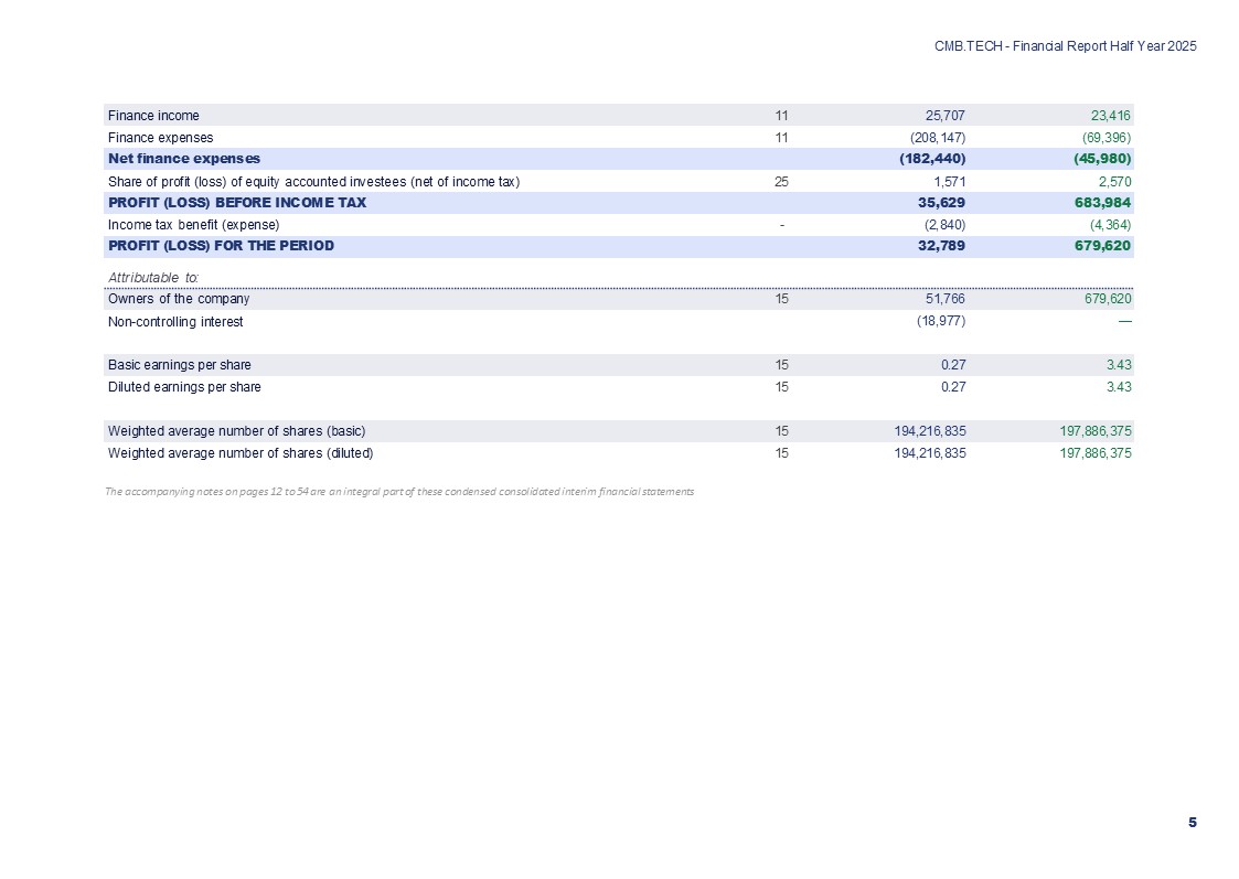 Finance income  11  25,707  23,416  Finance expenses  11  (208,147)  (69,396)  Net finance expenses  (182,440)  (45,980)  Share of profit (loss) of equity accounted investees (net of income tax)  25  1,571  2,570  PROFIT (LOSS) BEFORE INCOME TAX  35,629  683,984  Income tax benefit (expense)  -  (2,840)  (4,364)  PROFIT (LOSS) FOR THE PERIOD  32,789  679,620  Attributable to:  Owners of the company  15  51,766  679,620  Non-controlling interest  (18,977)  —  Basic earnings per share  15  0.27  3.43  Diluted earnings per share  15  0.27  3.43  Weighted average number of shares (basic)  15  194,216,835  197,886,375  Weighted average number of shares (diluted)  The accompanying notes on pages 12 to 54 are an integral part of these condensed consolidated interim financial statements  15  194,216,835  197,886,375  CMB.TECH - Financial Report Half Year 2025  5
