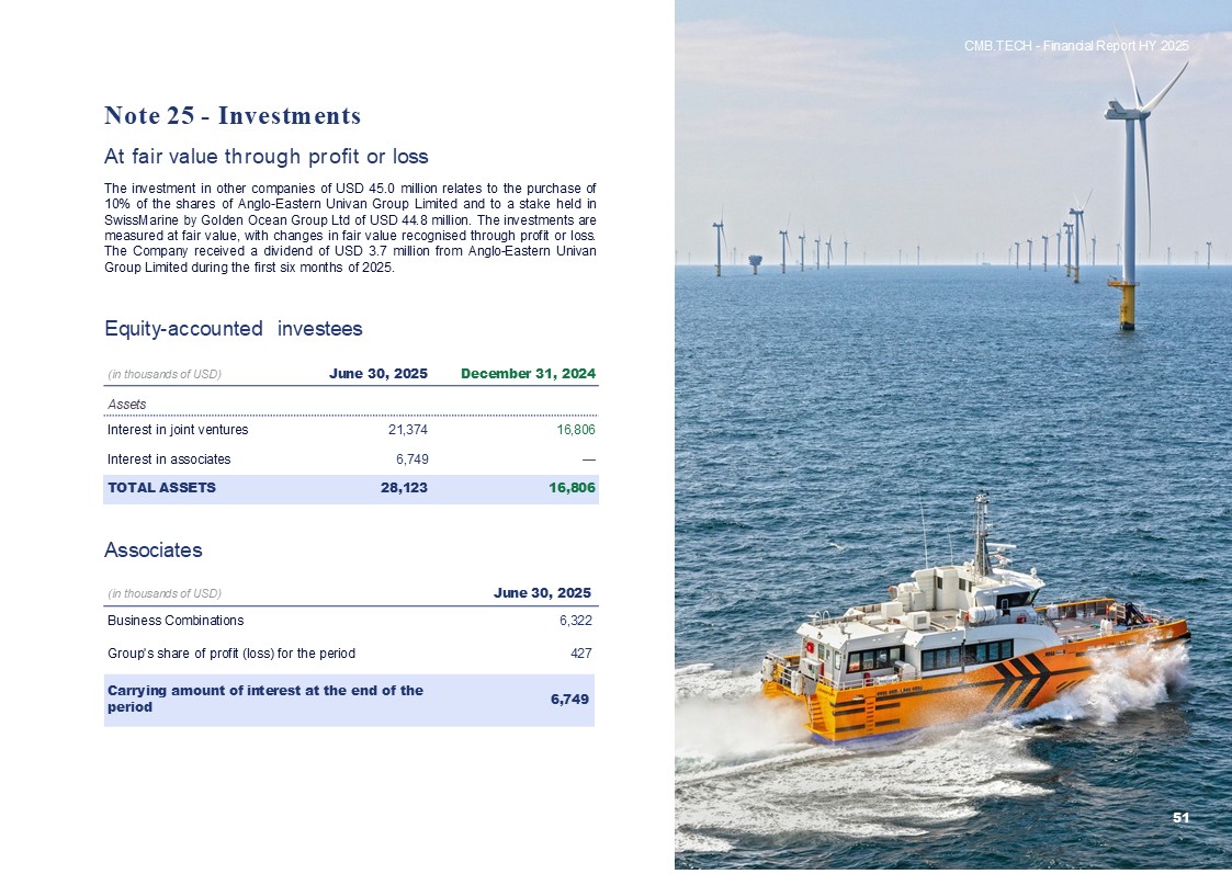 Note 25 - Investments  At fair value through profit or loss  The investment in other companies of USD 45.0 million relates to the purchase of 10% of the shares of Anglo-Eastern Univan Group Limited and to a stake held in SwissMarine by Golden Ocean Group Ltd of USD 44.8 million. The investments are measured at fair value, with changes in fair value recognised through profit or loss. The Company received a dividend of USD 3.7 million from Anglo-Eastern Univan Group Limited during the first six months of 2025.  Equity-accounted investees  (in thousands of USD) June 30, 2025  December 31, 2024  Assets  Interest in joint ventures 21,374  16,806  Interest in associates 6,749  —  TOTAL ASSETS 28,123  16,806  Associates  (in thousands of USD)  June 30, 2025  Business Combinations  6,322  Group's share of profit (loss) for the period  427  Carrying amount of interest at the end of the period  6,749  CMB.TECH - Financial Report HY 2025  51