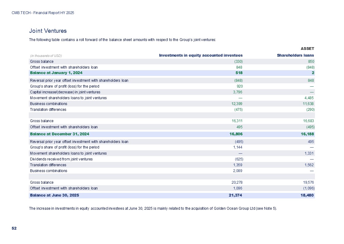 Joint Ventures  The following table contains a roll forward of the balance sheet amounts with respect to the Group’s joint ventures:  ASSET  (in thousands of USD)  Investments in equity accounted investees  Shareholders loans  Gross balance  (330)  850  Offset investment with shareholders loan  848  (848)  Balance at January 1, 2024  518  2  Reversal prior year offset investment with shareholders loan  (848)  848  Group's share of profit (loss) for the period  920  —  Capital increase/(decrease) in joint ventures  3,796  —  Movement shareholders loans to joint ventures  —  4,485  Business combinations  12,399  11,638  Translation differences  (475)  (290)  Gross balance  16,311  16,683  Offset investment with shareholders loan  495  (495)  Balance at December 31, 2024  16,806  16,188  Reversal prior year offset investment with shareholders loan  (495)  495  Group's share of profit (loss) for the period  1,144  —  Movement shareholders loans to joint ventures  —  1,331  Dividends received from joint ventures  (625)  —  Translation differences  1,359  1,562  Business combinations  2,089  —  Gross balance  20,278  19,576  Offset investment with shareholders loan  1,096  (1,096)  Balance at June 30, 2025  21,374  18,480  The increase in investments in equity accounted investees at June 30, 2025 is mainly related to the acquisition of Golden Ocean Group Ltd (see Note 5).  CMB.TECH - Financial Report HY 2025  52