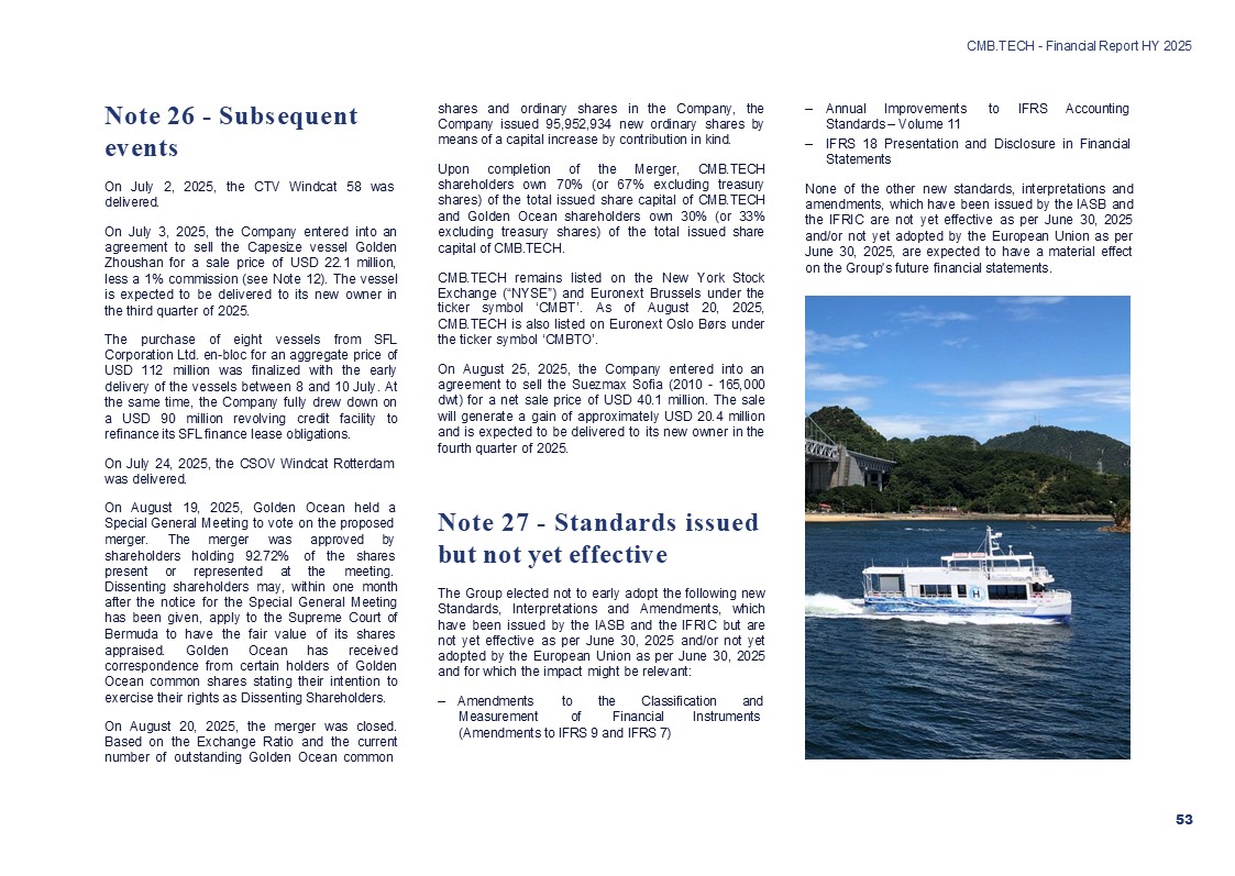 Note 26 - Subsequent events  On July 2, 2025, the CTV Windcat 58 was delivered.  On July 3, 2025, the Company entered into an agreement to sell the Capesize vessel Golden Zhoushan for a sale price of USD 22.1 million, less a 1% commission (see Note 12). The vessel is expected to be delivered to its new owner in the third quarter of 2025.  The purchase of eight vessels from SFL Corporation Ltd. en-bloc for an aggregate price of USD 112 million was finalized with the early delivery of the vessels between 8 and 10 July. At the same time, the Company fully drew down on a USD 90 million revolving credit facility to refinance its SFL finance lease obligations.  On July 24, 2025, the CSOV Windcat Rotterdam was delivered.  On August 19, 2025, Golden Ocean held a Special General Meeting to vote on the proposed  merger. The merger was approved by  shareholders holding 92.72% present or represented at  of the shares the meeting.  Dissenting shareholders may, within one month after the notice for the Special General Meeting has been given, apply to the Supreme Court of Bermuda to have the fair value of its shares  appraised. Golden Ocean has received correspondence from certain holders of Golden Ocean common shares stating their intention to exercise their rights as Dissenting Shareholders.  On August 20, 2025, the merger was closed. Based on the Exchange Ratio and the current number of outstanding Golden Ocean common  shares and ordinary shares in the Company, the Company issued 95,952,934 new ordinary shares by means of a capital increase by contribution in kind.  Upon completion of the Merger, CMB.TECH shareholders own 70% (or 67% excluding treasury shares) of the total issued share capital of CMB.TECH and Golden Ocean shareholders own 30% (or 33% excluding treasury shares) of the total issued share capital of CMB.TECH.  CMB.TECH remains listed on the New York Stock Exchange (“NYSE”) and Euronext Brussels under the ticker symbol ‘CMBT’. As of August 20, 2025, CMB.TECH is also listed on Euronext Oslo Børs under the ticker symbol ‘CMBTO’.  On August 25, 2025, the Company entered into an agreement to sell the Suezmax Sofia (2010 - 165,000 dwt) for a net sale price of USD 40.1 million. The sale will generate a gain of approximately USD 20.4 million and is expected to be delivered to its new owner in the fourth quarter of 2025.  Note 27 - Standards issued but not yet effective  The Group elected not to early adopt the following new Standards, Interpretations and Amendments, which have been issued by the IASB and the IFRIC but are not yet effective as per June 30, 2025 and/or not yet adopted by the European Union as per June 30, 2025 and for which the impact might be relevant:  – Amendments to the Classification and Measurement of Financial Instruments  (Amendments to IFRS 9 and IFRS 7)  – Annual Improvements to IFRS Accounting  Standards – Volume 11  – IFRS 18 Presentation and Disclosure in Financial Statements  None of the other new standards, interpretations and amendments, which have been issued by the IASB and the IFRIC are not yet effective as per June 30, 2025 and/or not yet adopted by the European Union as per June 30, 2025, are expected to have a material effect on the Group's future financial statements.  CMB.TECH - Financial Report HY 2025  53