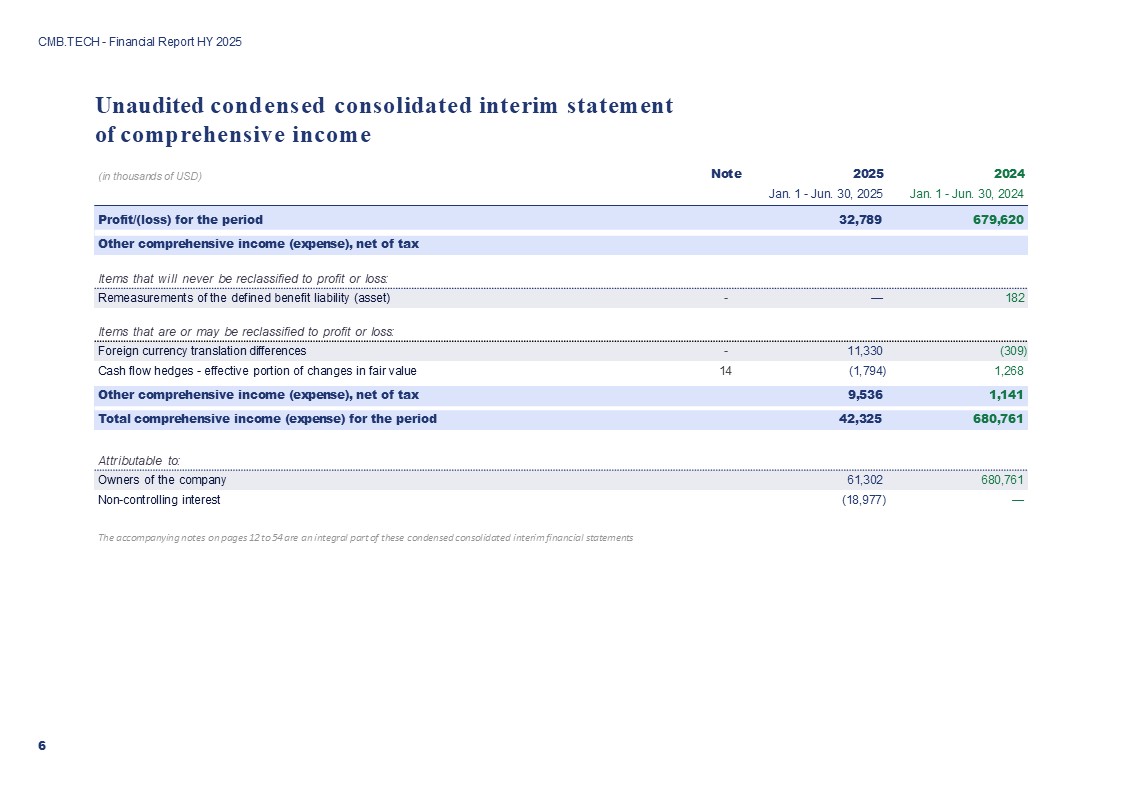 Unaudited condensed consolidated interim statement of comprehensive income  (in thousands of USD)  Note  2025  Jan. 1 - Jun. 30, 2025  2024  Jan. 1 - Jun. 30, 2024  Profit/(loss) for the period  32,789  679,620  Other comprehensive income (expense), net of tax  Items that will never be reclassified to profit or loss:  Remeasurements of the defined benefit liability (asset)  -  —  182  Items that are or may be reclassified to profit or loss:  Foreign currency translation differences  -  11,330  (309)  Cash flow hedges - effective portion of changes in fair value  14  (1,794)  1,268  Other comprehensive income (expense), net of tax  9,536  1,141  Total comprehensive income (expense) for the period  42,325  680,761  Attributable to:  Owners of the company  61,302  680,761  Non-controlling interest  (18,977)  —  The accompanying notes on pages 12 to 54 are an integral part of these condensed consolidated interim financial statements  CMB.TECH - Financial Report HY 2025  6