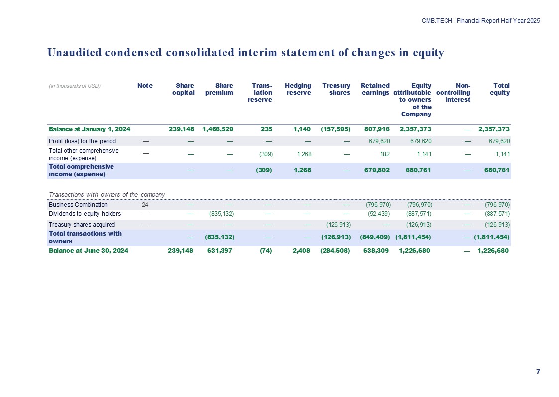 Unaudited condensed consolidated interim statement of changes in equity  Treasury shares acquired  —  —  —  —  —  (126,913)  —  (126,913)  — (126,913)  Total transactions with owners  —  (835,132)  —  —  (126,913)  (849,409)  (1,811,454)  — (1,811,454)  income (expense)  (in thousands of USD) Note  Share  Share  Trans-  Hedging  Treasury  Retained  Equity  Non-  Total  capital  premium  lation  reserve  shares  earnings  attributable  controlling  equity  reserve  to owners  interest  of the  Company  Balance at January 1, 2024  239,148  1,466,529  235  1,140  (157,595)  807,916  2,357,373  —  2,357,373  Profit (loss) for the period —  —  —  —  —  —  679,620  679,620  —  679,620  Total other comprehensive —  —  —  (309)  1,268  —  182  1,141  —  1,141  Total comprehensive income (expense)  —  —  (309)  1,268  —  679,802  680,761  —  680,761  Transactions with owners of the  company  Business Combination  24  — —  — — —  (796,970)  (796,970)  —  (796,970)  Dividends to equity holders  —  — (835,132)  — — —  (52,439)  (887,571)  —  (887,571)  Balance at June 30, 2024  239,148  631,397  (74)  2,408  (284,508)  638,309  1,226,680  — 1,226,680  CMB.TECH - Financial Report Half Year 2025  7