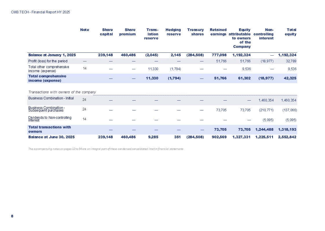 income (expense)  purchase  Subsequent purchases interest  Note  Share  Share  Trans-  Hedging  Treasury  Retained  Equity  Non-  Total  capital  premium  lation  reserve  shares  earnings  attributable  controlling  equity  reserve  to owners  interest  of the  Company  Balance at January 1, 2025  239,148  460,486  (2,045)  2,145  (284,508)  777,098  1,192,324  —  1,192,324  Profit (loss) for the period —  —  —  —  —  —  51,766  51,766  (18,977)  32,789  Total other comprehensive 14  —  —  11,330  (1,794)  —  —  9,536  —  9,536  Total comprehensive income (expense)  —  —  11,330  (1,794)  —  51,766  61,302  (18,977)  42,325  Transactions with owners of the company  Business Combination - Initial 24  —  —  —  —  —  —  —  1,460,354  1,460,354  Business Combination - 24  —  —  —  —  —  73,705  73,705  (210,771)  (137,066)  Dividends to Non-controlling 14  —  —  —  —  —  —  —  (5,095)  (5,095)  Total transactions with owners  —  —  —  —  —  73,705  73,705  1,244,488  1,318,193  Balance at June 30, 2025  239,148  460,486  9,285  351  (284,508)  902,569  1,327,331  1,225,511  2,552,842  The accompanying notes on pages 12 to 54 are an integral part of these condensed consolidated interim financial statements  CMB.TECH - Financial Report HY 2025  8