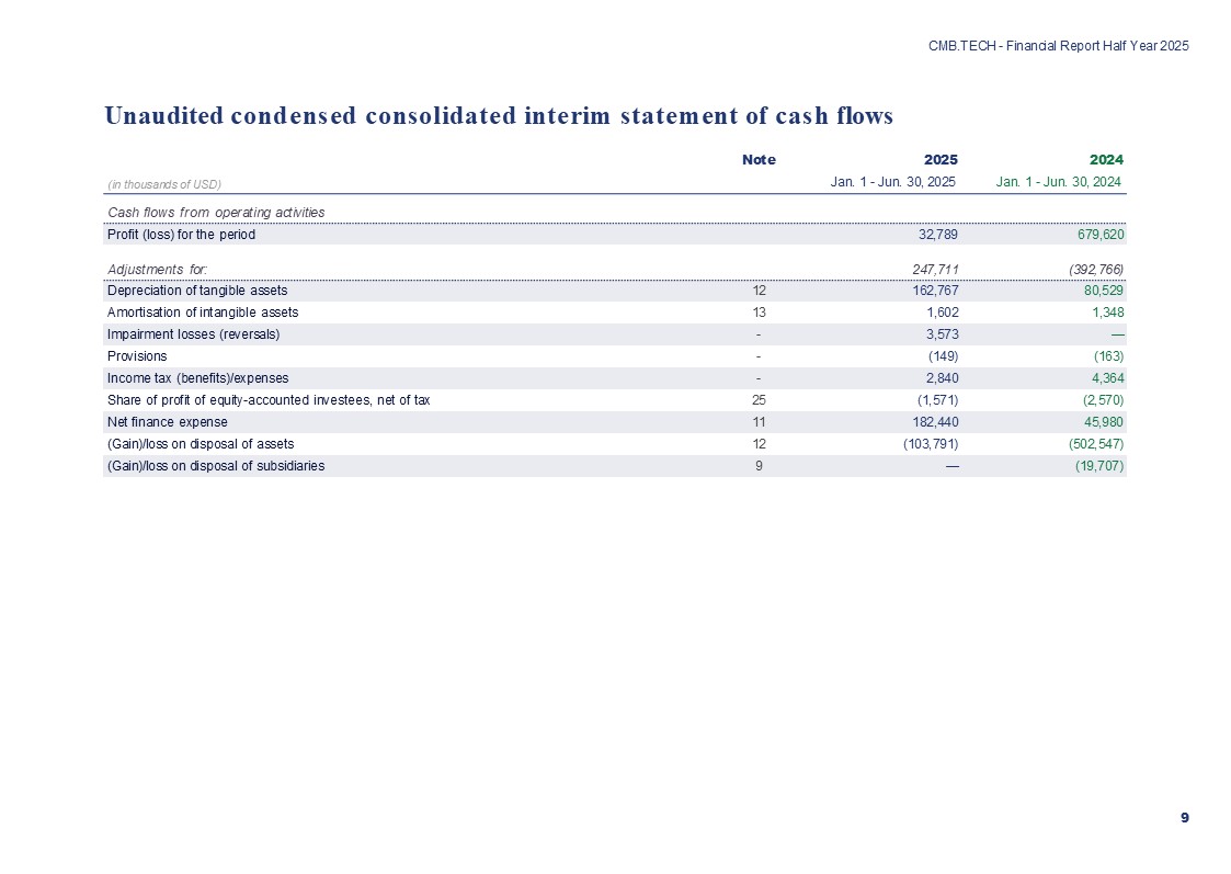 Unaudited condensed consolidated interim statement of cash flows  (in thousands of USD)  Note  2025  Jan. 1 - Jun. 30, 2025  2024  Jan. 1 - Jun. 30, 2024  Cash flows from operating activities  Profit (loss) for the period  32,789  679,620  Adjustments for:  247,711  (392,766)  Depreciation of tangible assets  12  162,767  80,529  Amortisation of intangible assets  13  1,602  1,348  Impairment losses (reversals)  -  3,573  —  Provisions  -  (149)  (163)  Income tax (benefits)/expenses  -  2,840  4,364  Share of profit of equity-accounted investees, net of tax  25  (1,571)  (2,570)  Net finance expense  11  182,440  45,980  (Gain)/loss on disposal of assets  12  (103,791)  (502,547)  (Gain)/loss on disposal of subsidiaries  9  —  (19,707)  CMB.TECH - Financial Report Half Year 2025  9