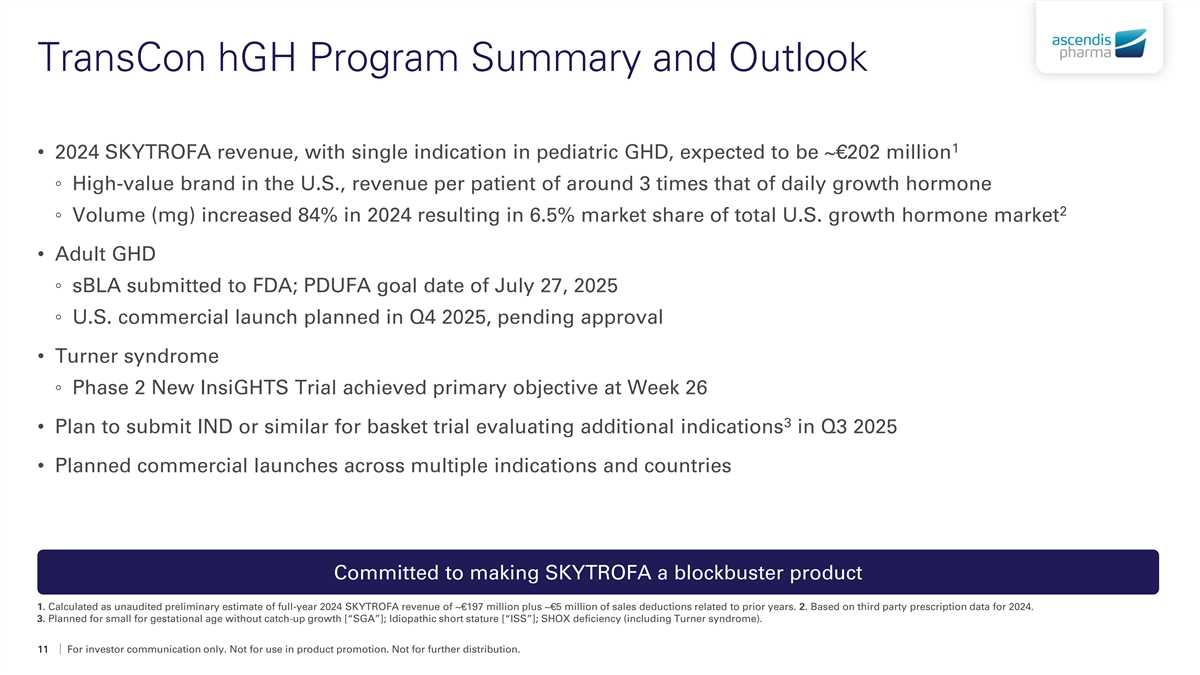 SKYTROFA - High Value Growth Hormone Brand • Launched for pediatric growth hormone deficiency SKYTROFA Revenue (€ million) in U.S. in Q4 21, Germany in Q3 23 ◦ Successful Phase 3 riGHt Trial in Japan € 225 1 € 202 ◦ Planned expansion across multiple countries € 200 € 179 € 175 • Planned label expansion to drive growth € 150 ◦ sBLA accepted for adult growth hormone € 125 deficiency; PDUFA goal date of July 27, 2025 € 100 ◦ Positive topline results from Phase 2 New € 75 InsiGHTS Trial in Turner syndrome € 50 € 36 ◦ Submit IND or similar for a basket trial evaluating 2 € 25 additional indications in Q3 2025 € 1 € - 2021 2022 2023 2024E Committed to making SKYTROFA the global leading product in value in a growing growth hormone market sBLA = supplemental Biologics License Application. 1. Calculated as unaudited preliminary estimate of full year 2024 SKYTROFA revenue of ~€197 million plus ~€5 million of sales deductions related to prior years. 2. Planned for small for gestational age without catch-up growth [“SGA”]; Idiopathic short stature [“ISS”]; SHOX deficiency (including Turner syndrome). 10 For investor communication only. Not for use in product promotion. Not for further distribution.